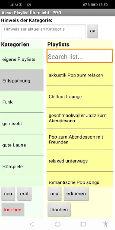 Create categories for your favorite playlists, e.g. Pop, relaxation, party, etc. Then assign the appropriate playlists to each category. These may e.g. from Prime Music, Online Radio or Spotify. Each category can be marked with a note in which you can enter e.g. You can note with which command playlists of this category are started, eg Alexa, start TuneIn and play playlistname.