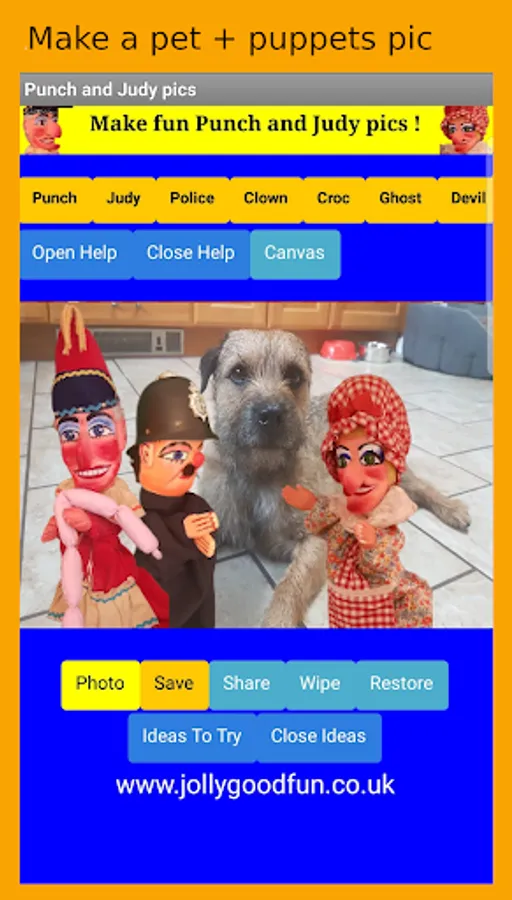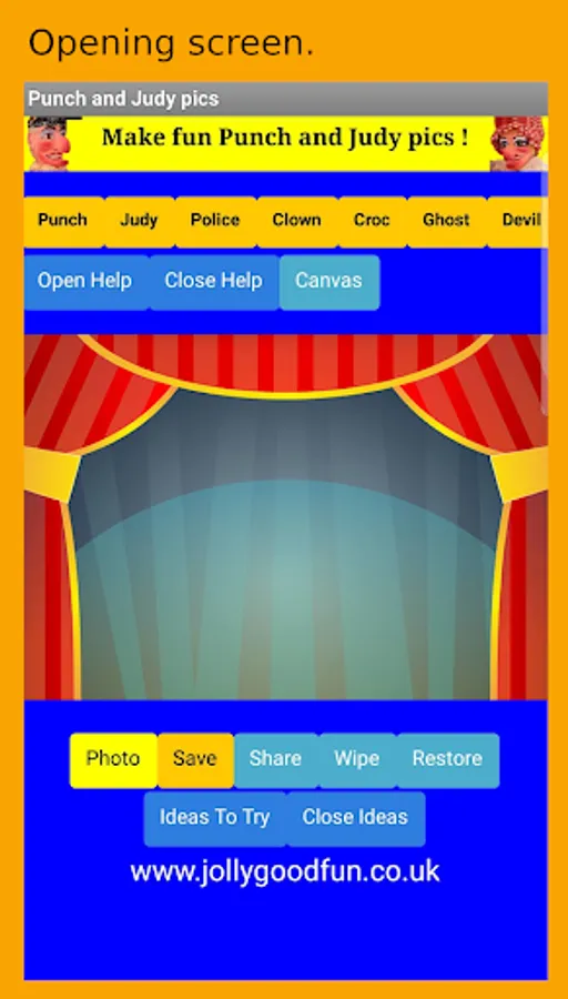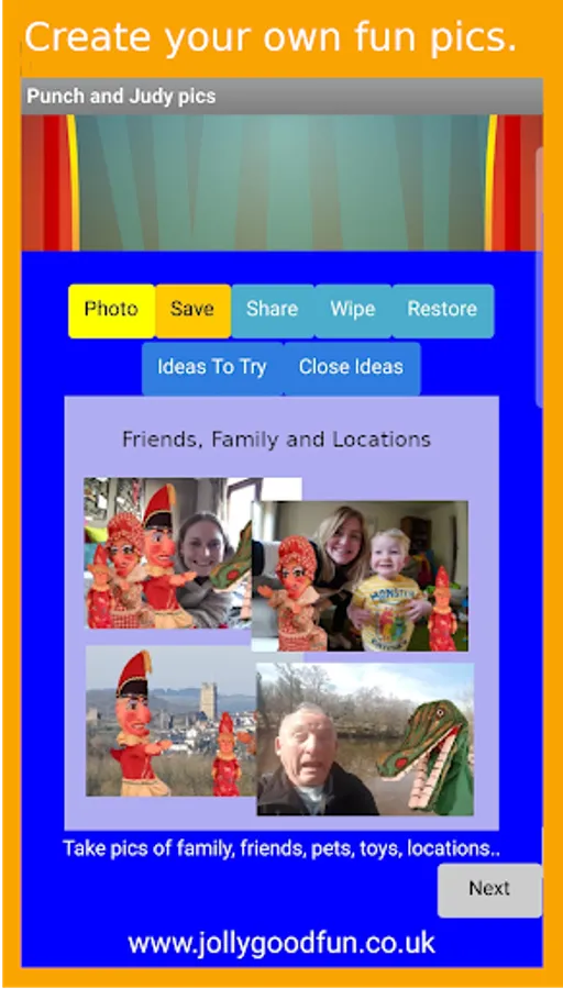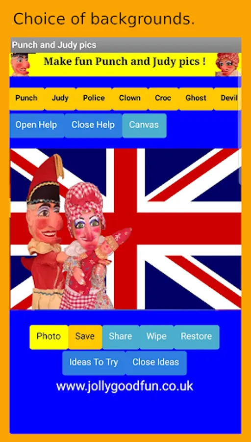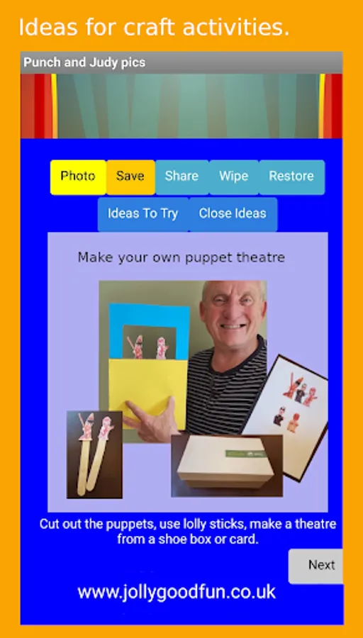 Create fun photos and images using your phones built in camera or the preset backgrounds provided, then add images of the Punch and Judy puppets. You can save a copy of your Punch and Judy pic to the app memory or use the share button to either email it to yourself or post it on your social media page. The app also includes suggestions for craft activities that families can do together.