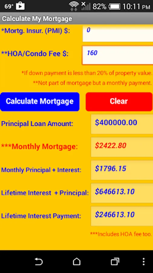 For mortgage calculation, user enters value of property, down payment, interest rate, mortgage years, Private Mortgage Insurance (PMI), property tax, home (hazard) insurance, as well as Home Owner Association (HOA) or condominium fee in the respective fields as inputs in first screen. After touching "Calculate Mortgage" key, this app will display monthly mortgage payment and monthly payment of principal and interest. It also prints principal loan amount, the lifetime principal and interest in the given loan as well as the total amount of interest will be paid at the end of term.