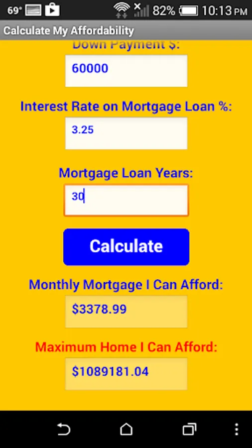 For affordability calculation, users goes to second screen by touching "Go to Affordability" key. In second screen, user enters his gross (before tax) annual income along with down payment and after touching "Calculate" key, this app will print maximum monthly payment and maximum home price you can afford. It also lists some common rules which lenders use to figure it out your loan qualification.