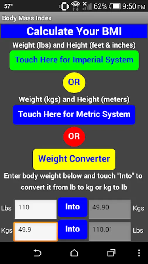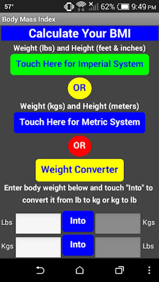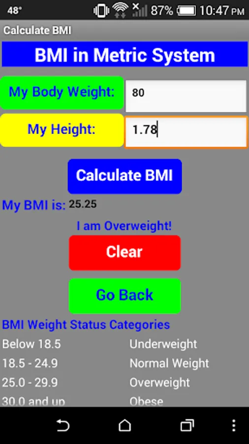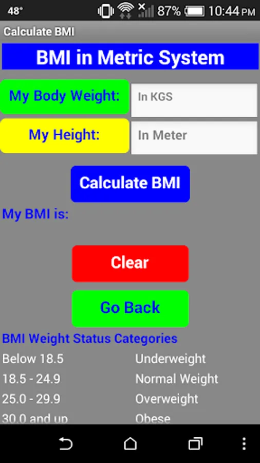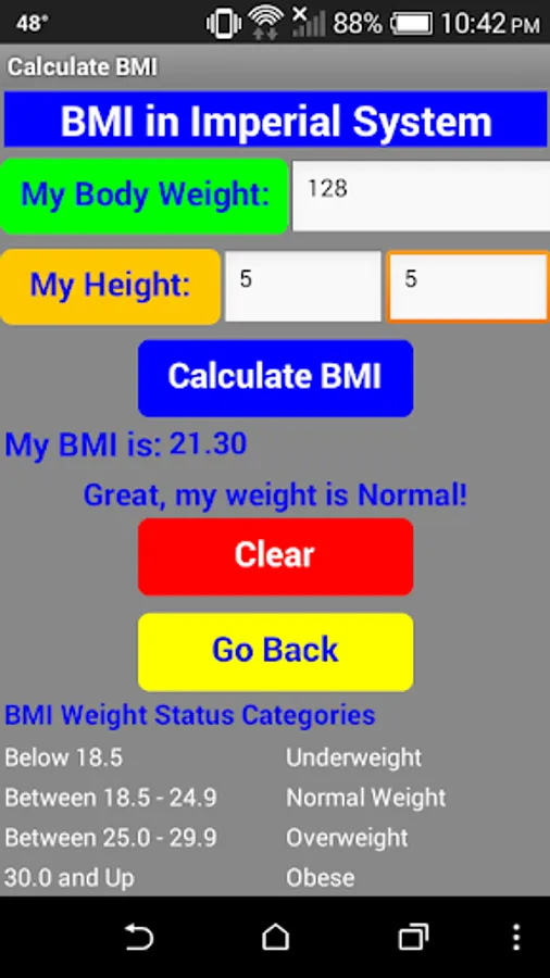 After entering weight and height information, users touch "Calculate BMI" key to calculates BMI Index. It tells individuals what is their BMI value and under which categories they fall under. It could be: