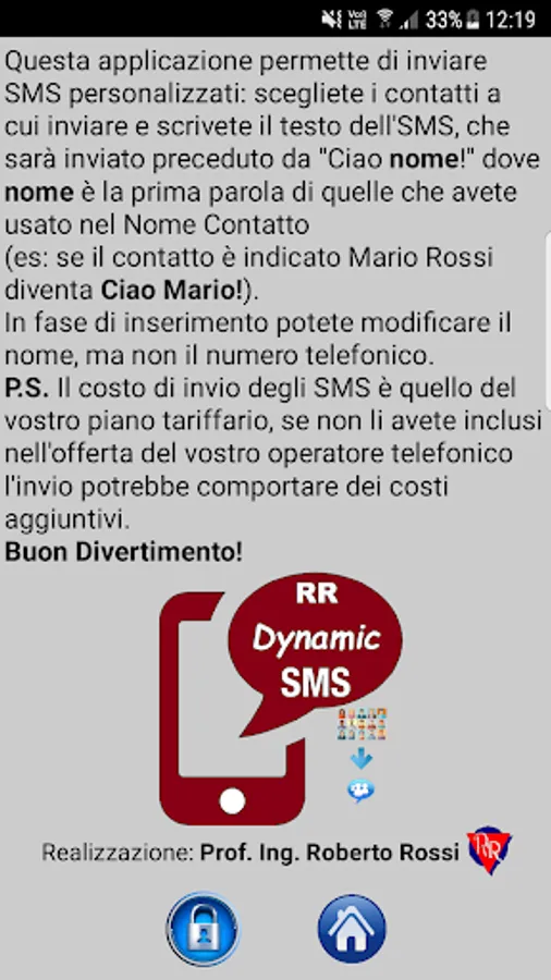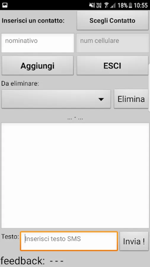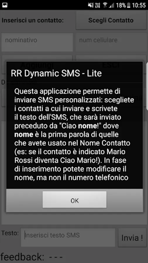 The operation screen of the app is presented in this way: is shown a dialog box that resembles the app operation and then shows the user interface itself. Using the Select Contact button you can select a contact from your address book. The chosen contact appears (the chosen name can be changed if "anomalies" that you can pass on to customize the SMS, the phone number not) and, via the Add button, added to the contacts list to which to send the 'SMS. If we repent of the addition, a contact can also be removed from the list by selecting it from a drop-down menu, using the Delete button.