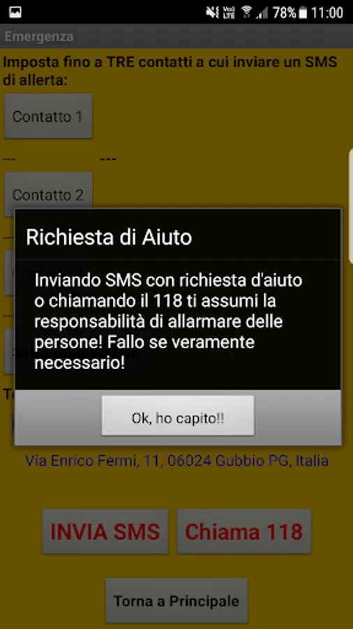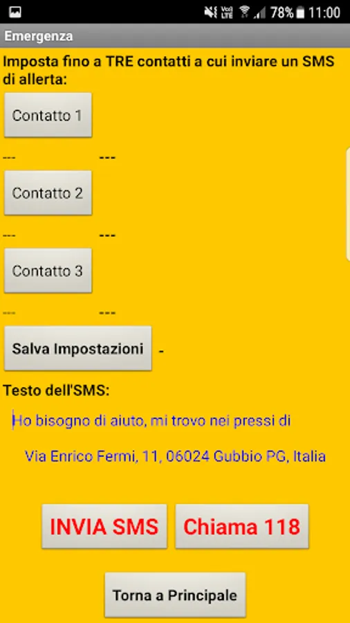 - Set up to three contacts to which, in an emergency, send a text message containing a request for help including the address where you are at the time of;