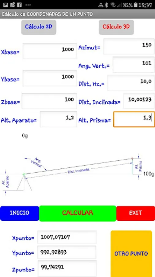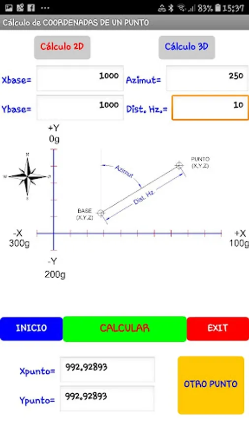 In the first, 2D calculation, default screen, asks us, on the left, the X and Y coordinates of the base, or known point and on the right the azimuth and the horizontal distance to the read point. Once the required data has been entered, we give the calculation button and it will give us the result of the coordinates, X and Y, of the point.
