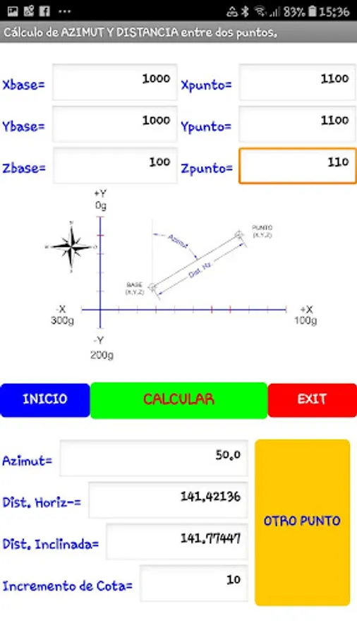 On the left, the X, Y and Z coordinates of the base, and on the right the X, Y and Z coordinates of the point. Once the required data has been entered, we will click on the calculate button and it will give us the result, in the lower part of the screen, Azimuth, Horizontal Distance, Inclined Distance and Dimension increase.
