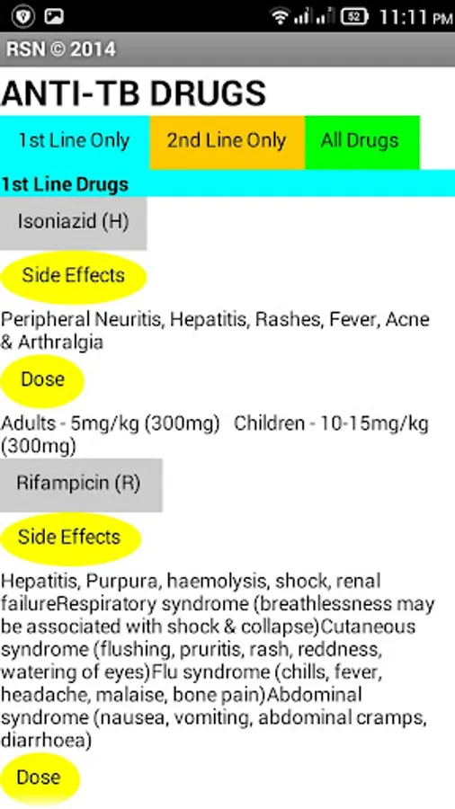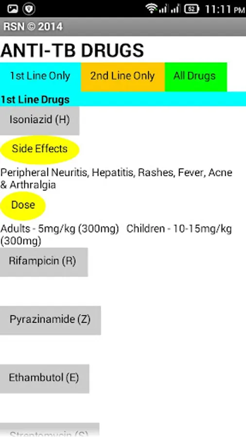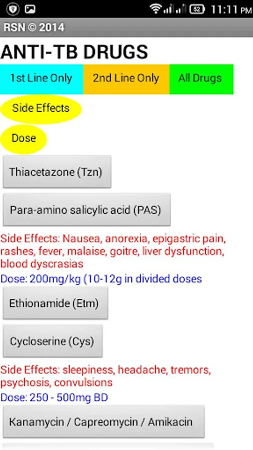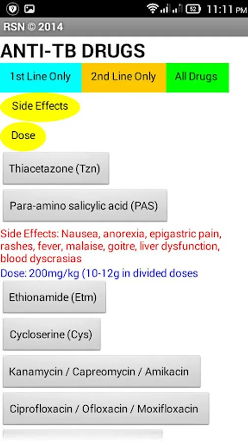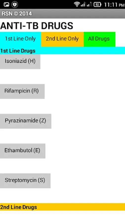 for medical students, a simple list of 1st & 2nd line drugs given for TB Rx