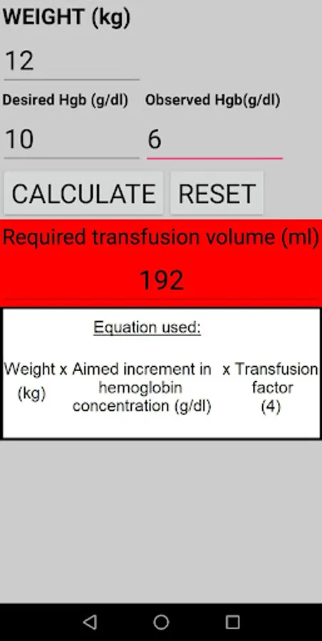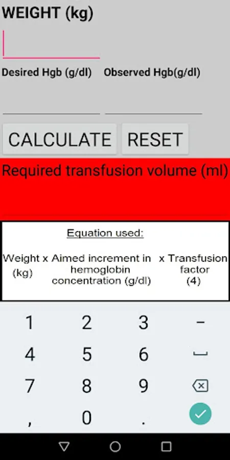 The application is a digital document to facilitate the calculation of blood volumen trasfusion in a pediatric patient.It is aimed at healthcare professionals in the pediatric surgical field.The purpose is to provide a tool to perform a quick and efficient calculation.