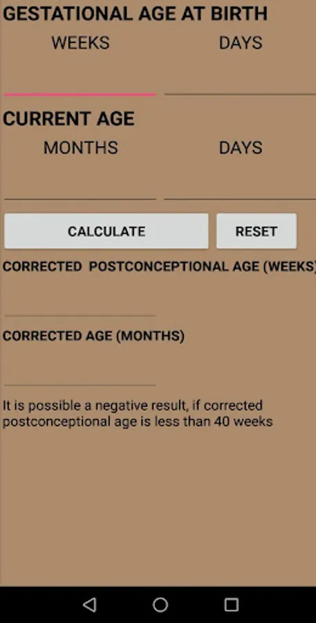 This APPis a digital document for calculation, in premature babies, corrected ages (months) and gestational age (weeks). Taking reference to 40 weeks (9.2 months) as a full-term birth. It is not a medical device, there is no operation in the diagnosis or treatment, and its acorrding to European laws about mHeath.Its use does not substitute the medical criterion nor the relationship with the patient. It is directed to health professionals. It has been designed through the tool APPinventor2. In order to avoid errors, when the necessary parameters are not presented, the application will not provide any calculation. Before its publication has been tested with healthcare professionals. Before any error you can contact the owner of the application. Doctor Ferreras,pediatric anesthesia consultant. (rubenferrerasvega@hotmail.com). There are no conflicts of interest. Updates will be notified to the user through the Google Play Store. The calculations are based on basic mathematical formulas of unit change (weeks, days, months). It does not replace the criterion of the health professional, taking responsibility for the use of it. The author is committed to reviewing the use of health and its ethical implications. Please notify improvements to avoid incidents related to their use to the owner's email. The use of applications is intuitive. If you have any questions about the legislation, (SPANISH LANGUAGE) visit https://anestesiar.org/2018/mhealth-el-uso-de-aplicaciones-moviles-en-medicina/