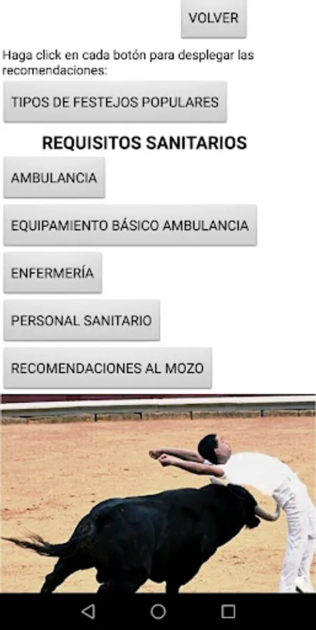 The purpose is to provide a simple tool that helps the health professional, organizational authorities and collect the recommendations to the participants of a bullfighting celebration (both professionals and waiters).