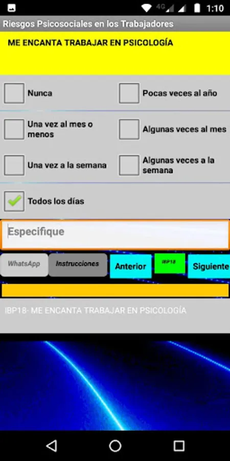 By sampling the Sociodemographic Data Questionnaire and Work with situations of Violence (González, 2020), the Burnout Inventory of Psychologists (Benavides, et al., 2002) and the Inventory of Stress Symptoms (Benavides, Moreno) are applied to Psychologists -Jiménez, Garrosa & González, 2020). The main advantages of filling it in the mobile device are: It does not depend on a physical space or on a schedule or printed material; questions can be corrected at any time. In addition to having validations by requiring to send that all questions have been answered and eliminating double and blank answers. At the end the codes with their responses are sent by WhatsApp in a comma separated format (CSV); in such a way that you can tabulate the information in any Application.