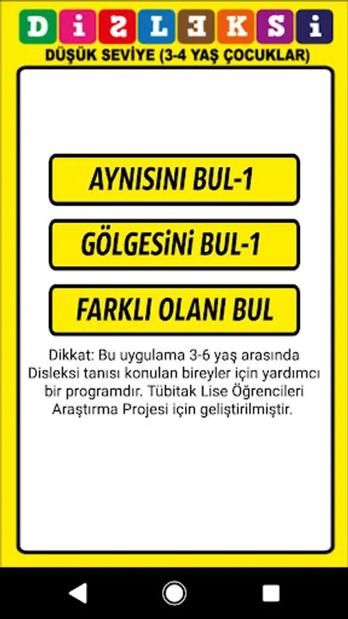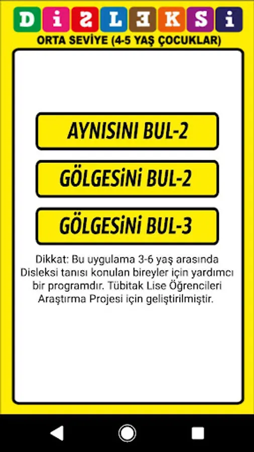 An android-based mobile game application developed to support the teaching of individuals between 3-6 years of age diagnosed or at risk of dyslexia through multiple sensory and mobile learning methods and to determine the state of dyslexia.