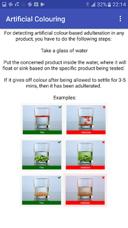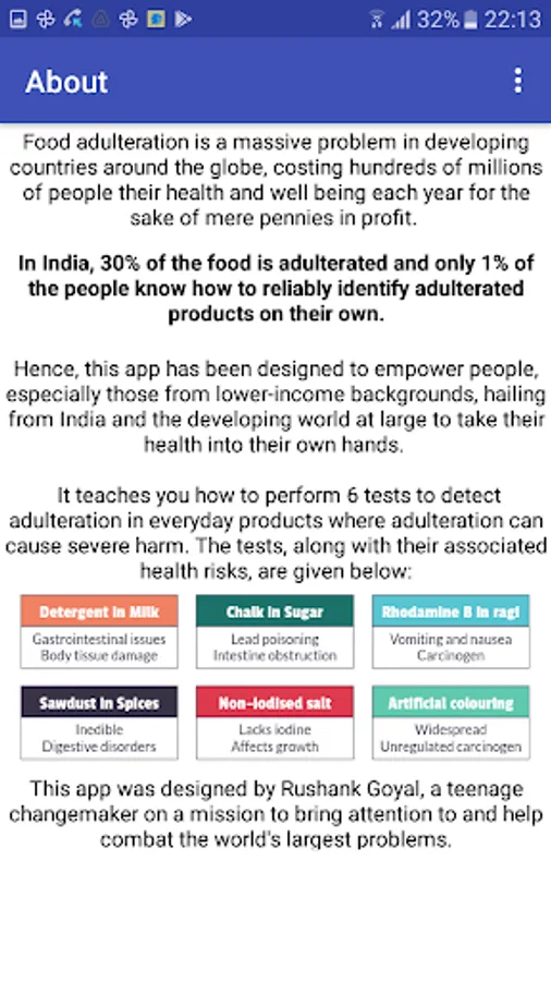 Hence, this app has been designed to empower people, especially those from lower-income backgrounds, hailing from India and the developing world at large to take their health into their own hands. It teaches you how to perform 6 tests to detect adulteration in everyday products where adulteration can cause severe harm.