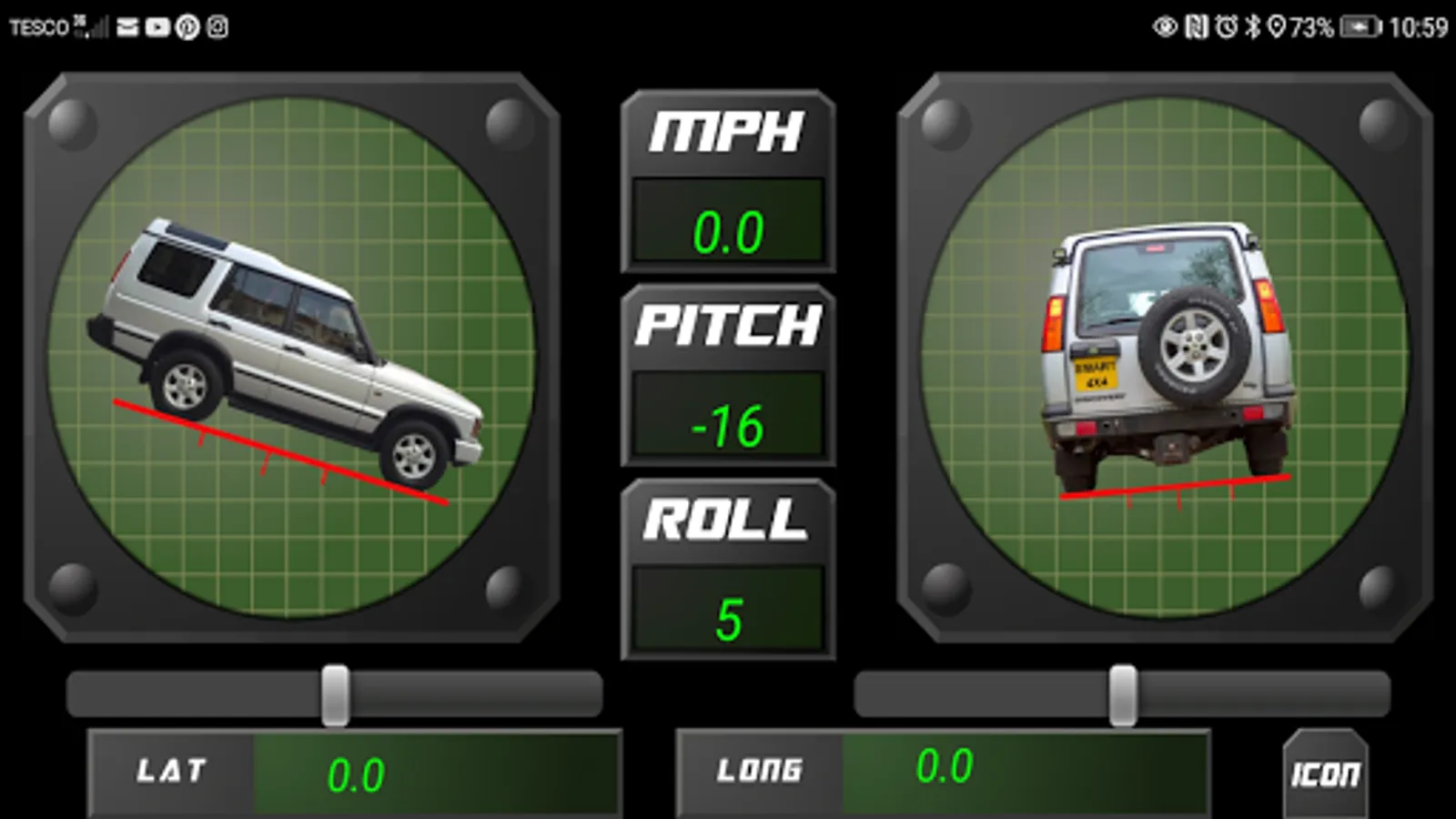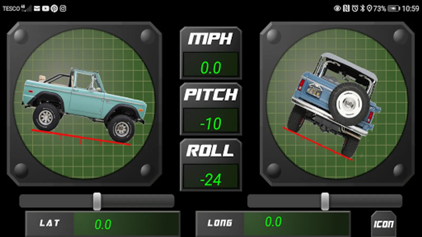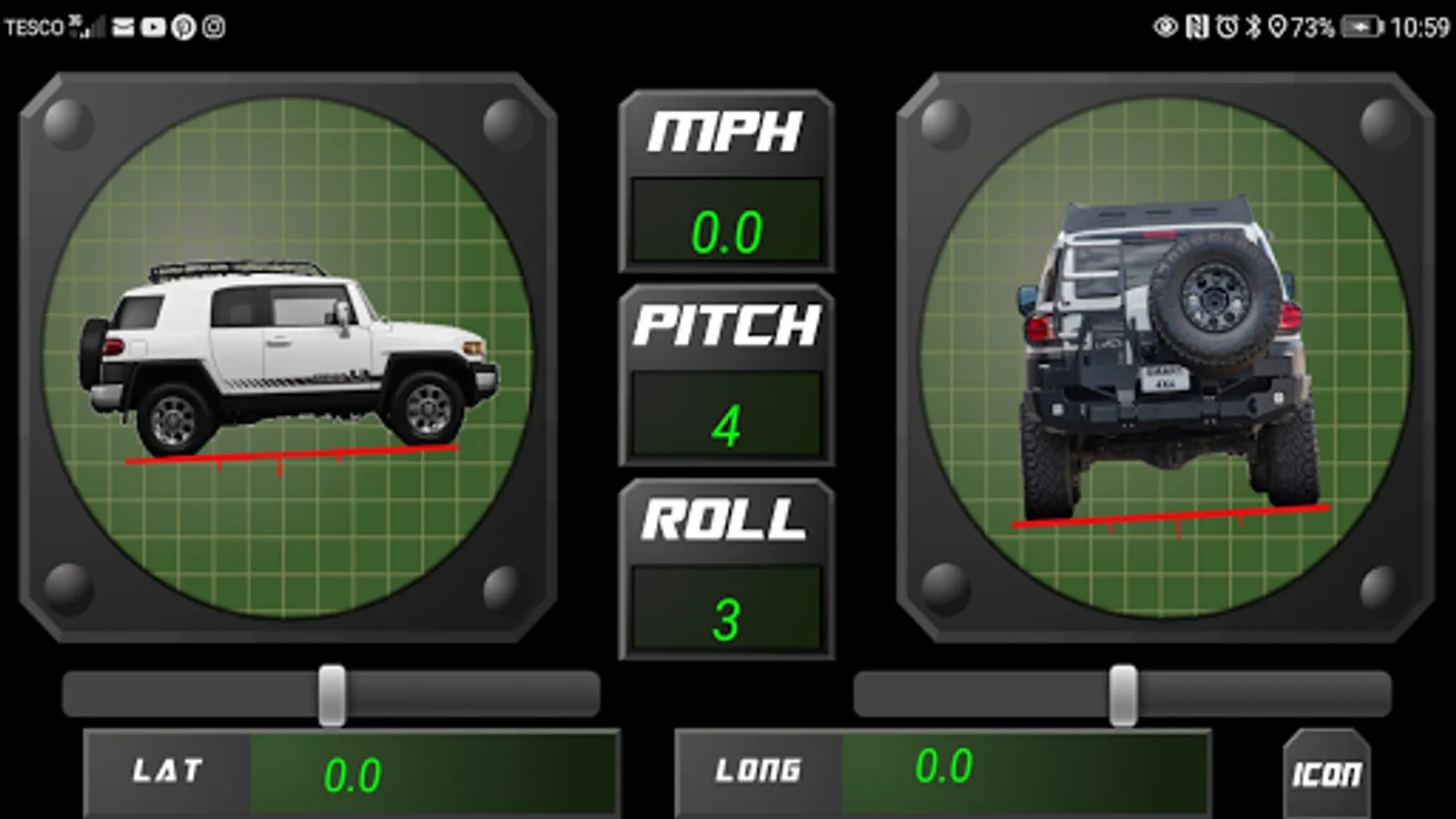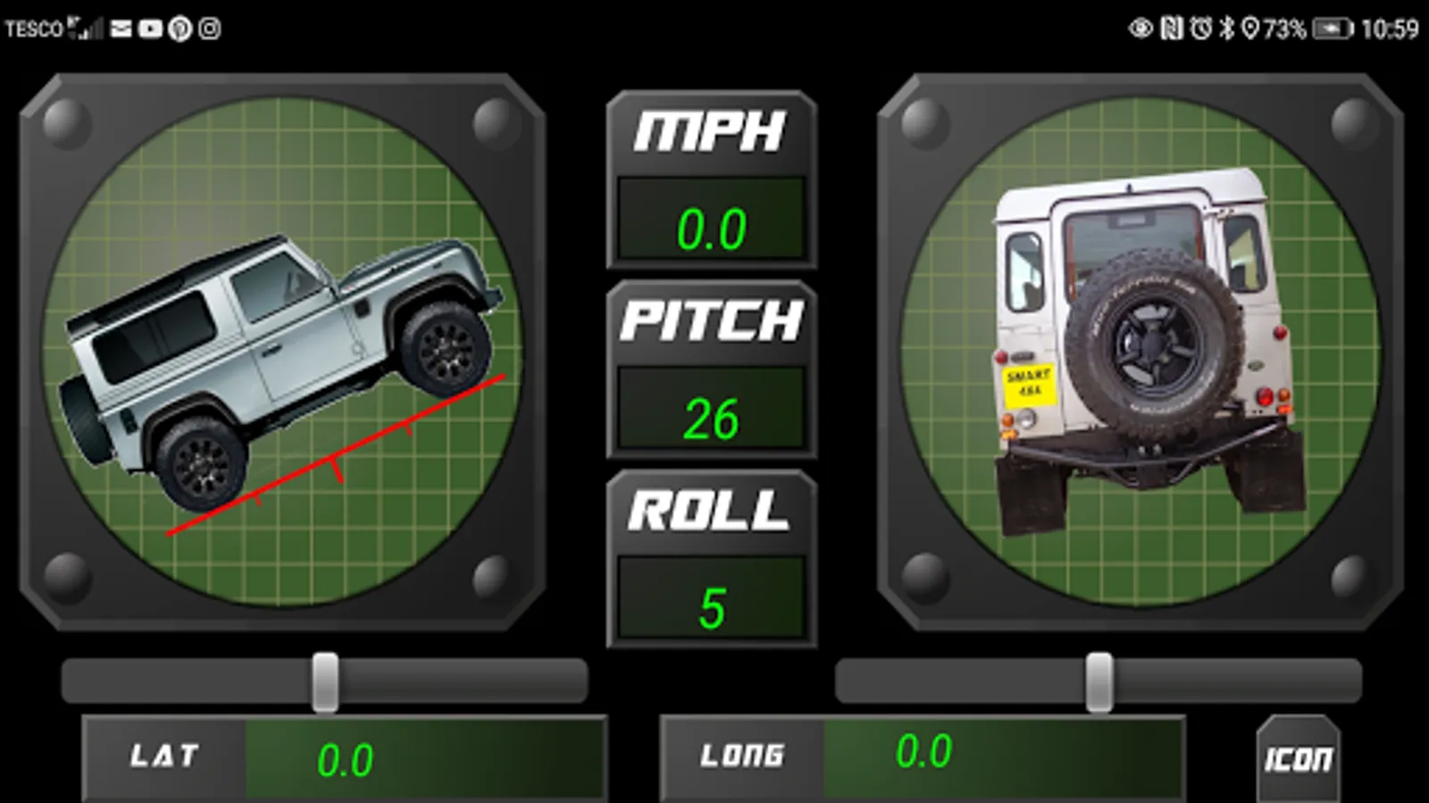 Smart 4x4 provides you with an artificial horizon for when you are out on the trail; showing roll, incline and decline with animated car icons. Latitude and longitude are also displayed with GPS speed.