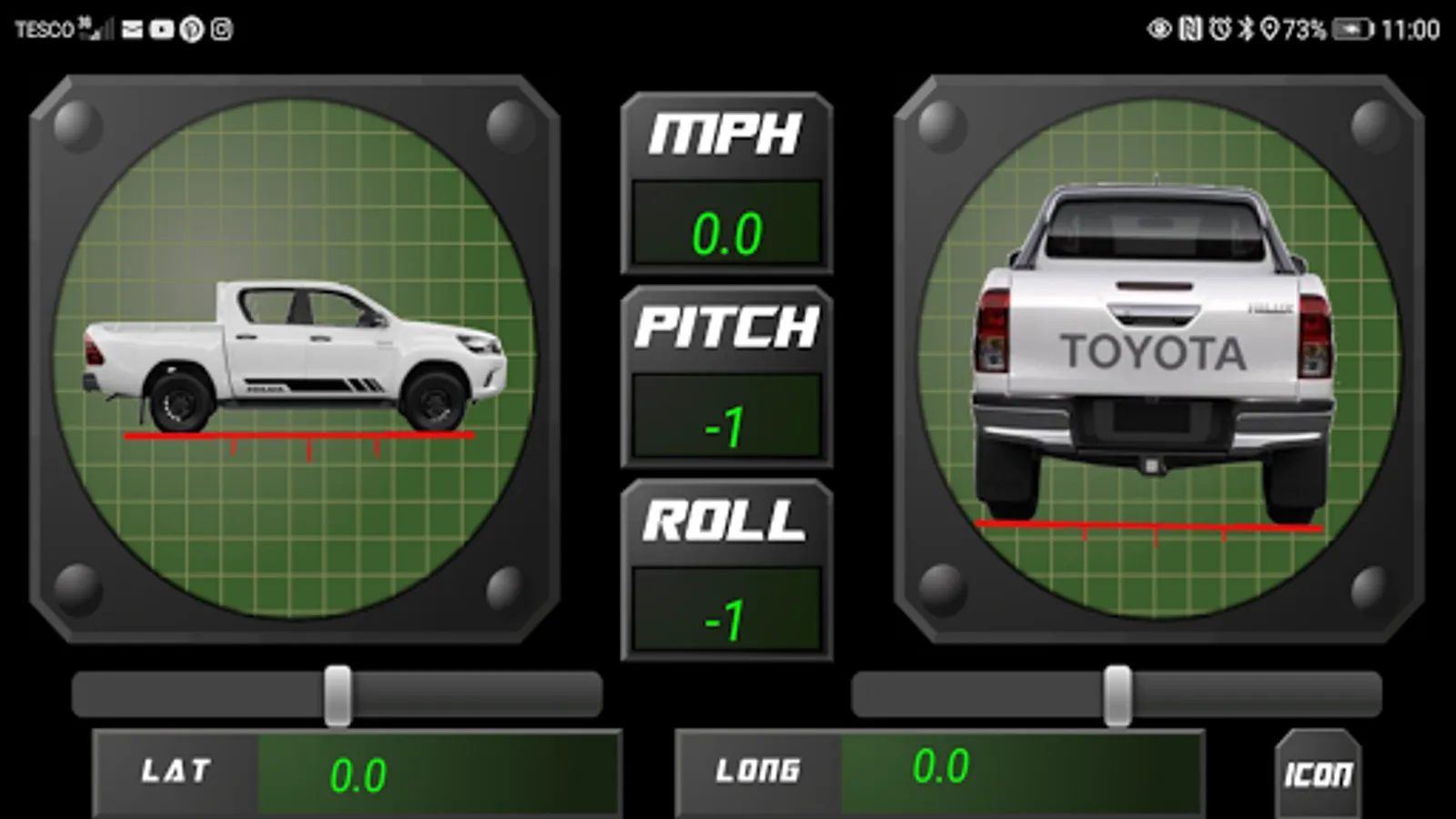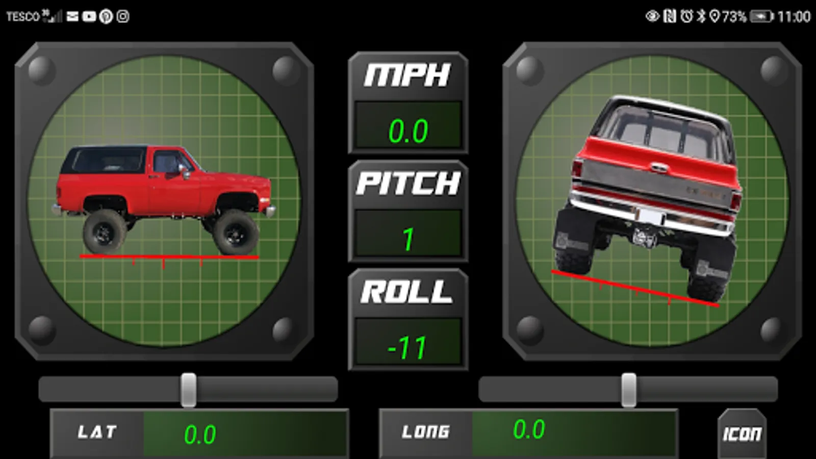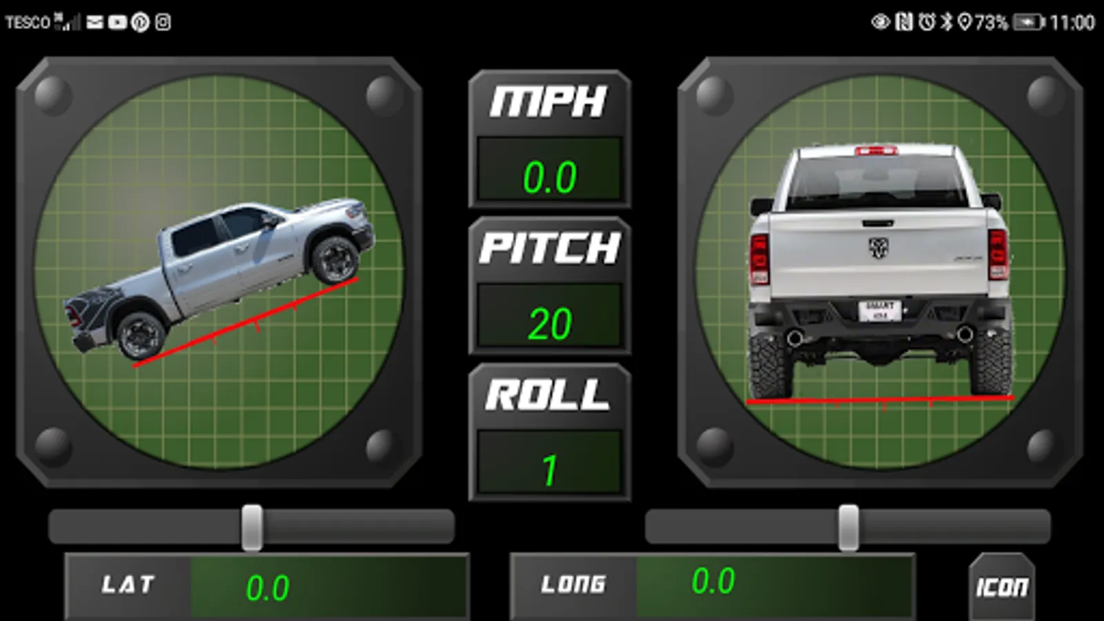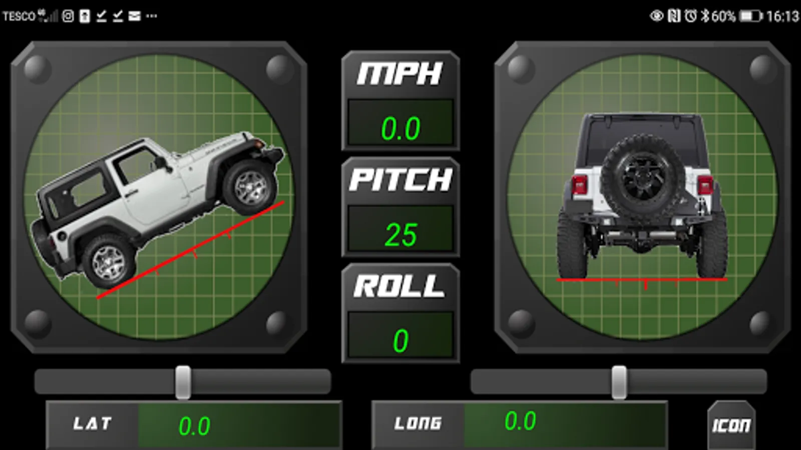 Smart 4x4 provides you with an artificial horizon for when you are out on the trail; showing roll, incline and decline with animated car icons. Latitude and longitude are also displayed with GPS speed.