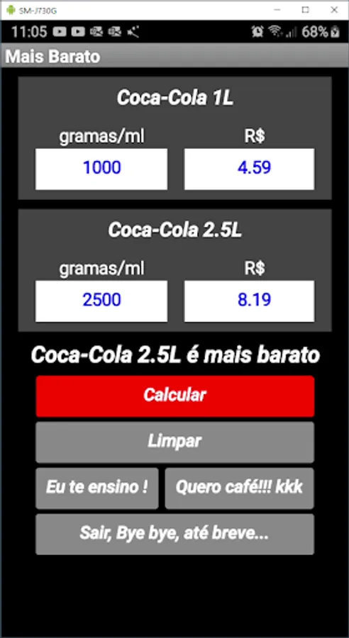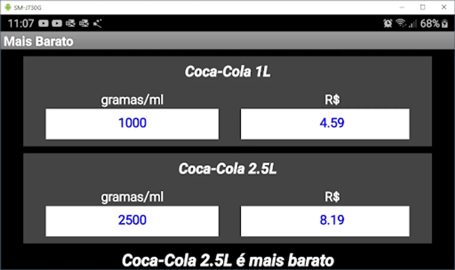 Find the cheapest price between 2 products with different quantities and values in a supermarket. Example: 2.5L Coca-Cola for R$ 8.19 and 1L for R$ 4.59 which would you buy, which is cheaper? Hard to know right, without doing the math, that's why I developed the app to help you know which is the cheapest. You enter the ml or grams of the 2 products and the 2 prices then click on Calculate and the MaisBarato App already informs you which is the cheapest, you also have the option of putting the name of the products. There is a button to clear the fields, another is I teach you, fill in the fields so the user knows how it works. Simple and lightweight application, easy to use even for older people. The buttons are in simple text and easy to understand. Even the exit button has been put in, as I see some seniors struggling to exit apps. Happy shopping, with savings!!!
