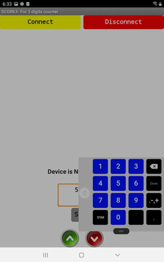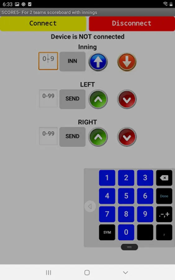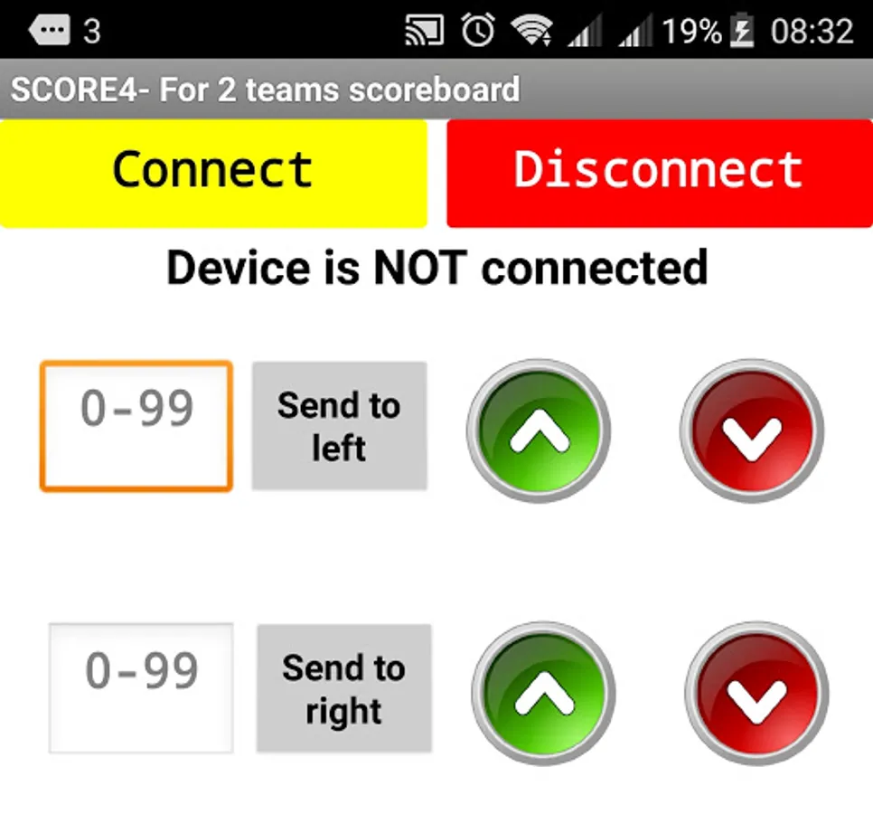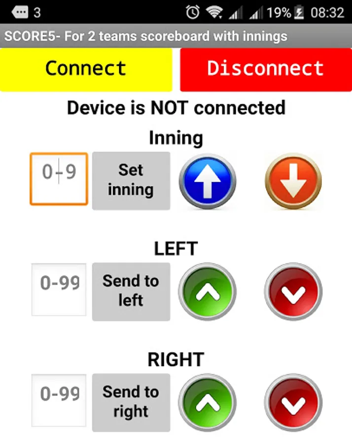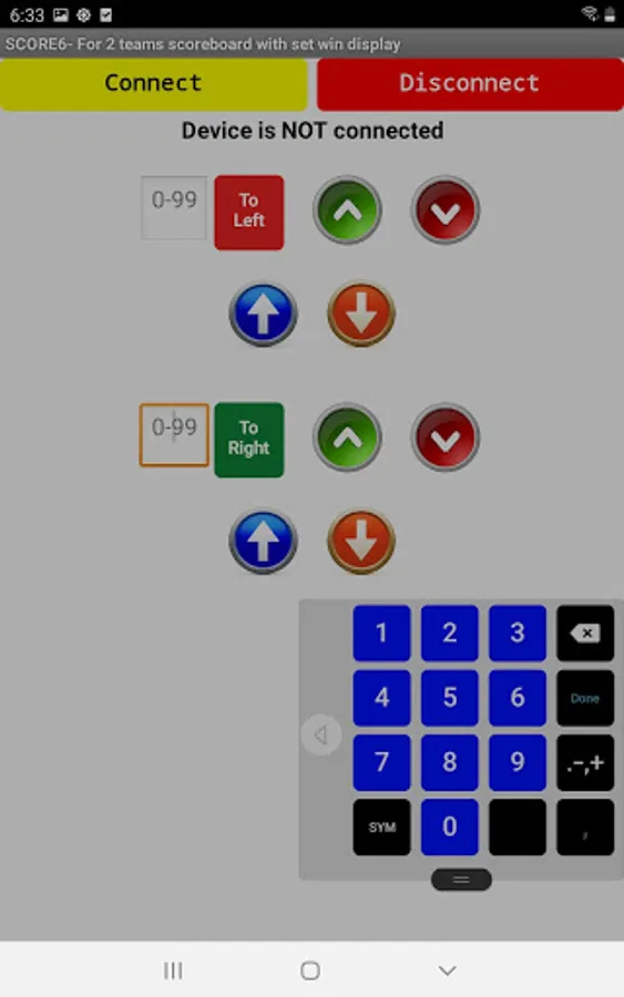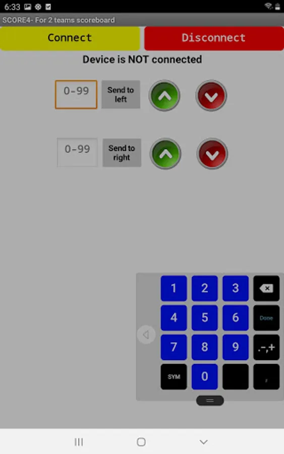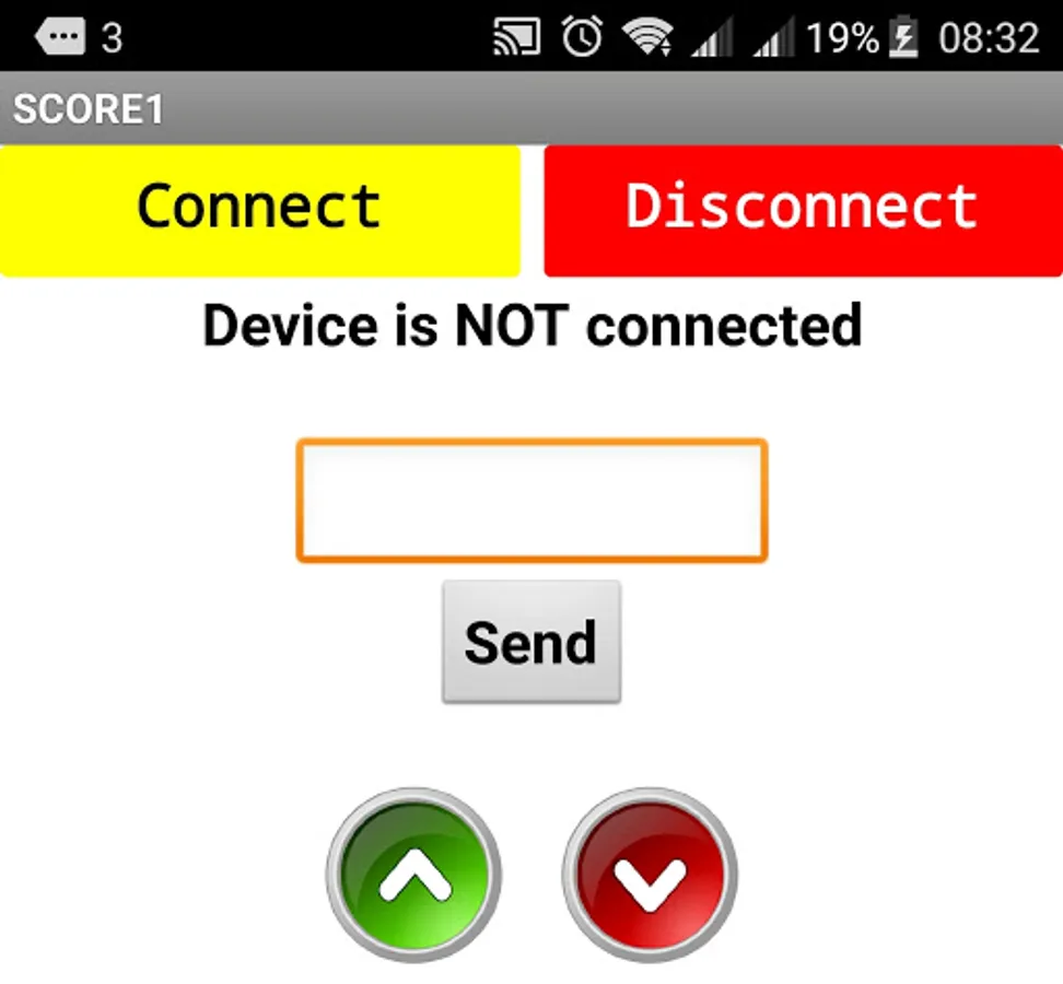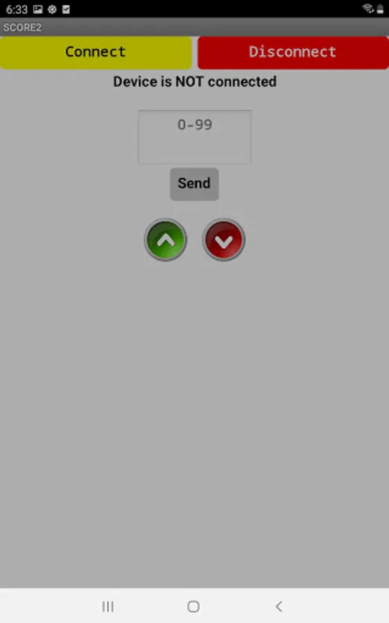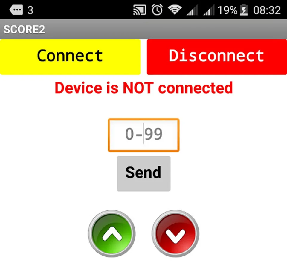 The app sends up and down control signals as well as specific numbers to the Scoreduino devices.