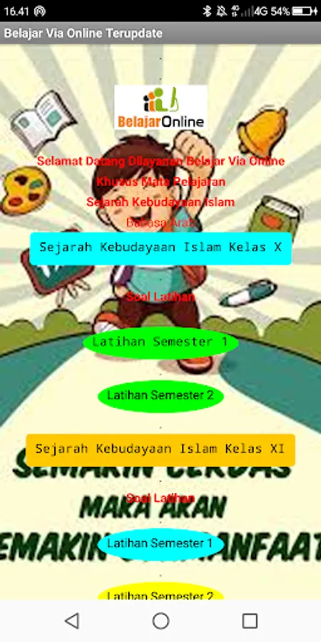 This online learning application is specifically created to facilitate students in learning Islamic Cultural History and Arabic Language starting from class X, XI and class XII. This application is equipped with Learning Material Whole and also equipped with Exercise Questions Online. This application is simple and free and with no ads in it. This application is endowment for all those who need it.