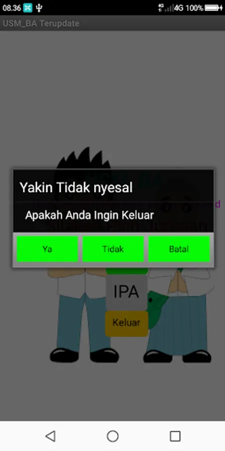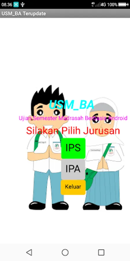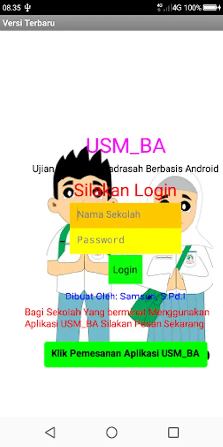Application of Madrasah Semester Test Based on Android or abbreviated as (USM_BA) is the latest version of the application which is better than the previous version, there are improvements from the previous application such as: 1. Appearance 2. The login is fixed if the previous one is just an exsen. But this version is correct really, for those who do not know the name of the school / madrasa and the password, then yes can not log in.