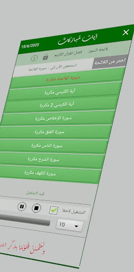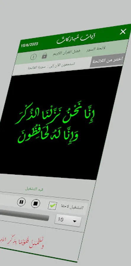 The application allows the ability to repeat the surah, and listen to the surah saved in the memory when opening the application ..