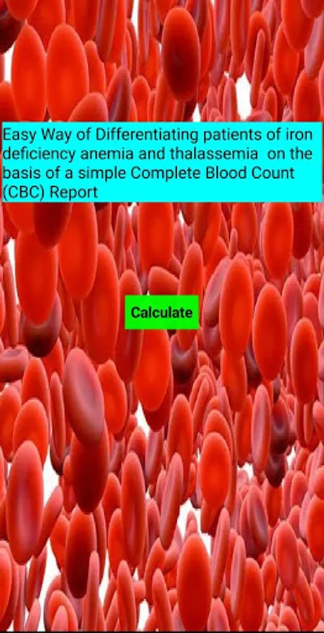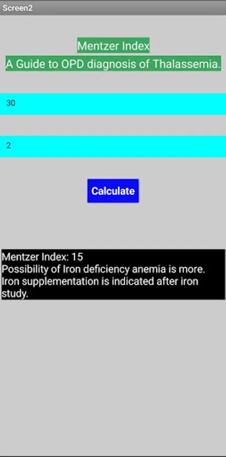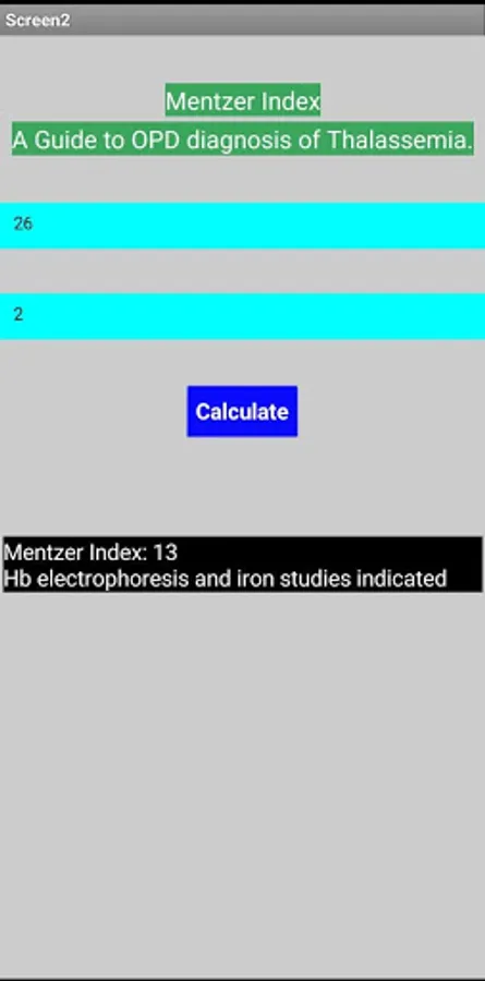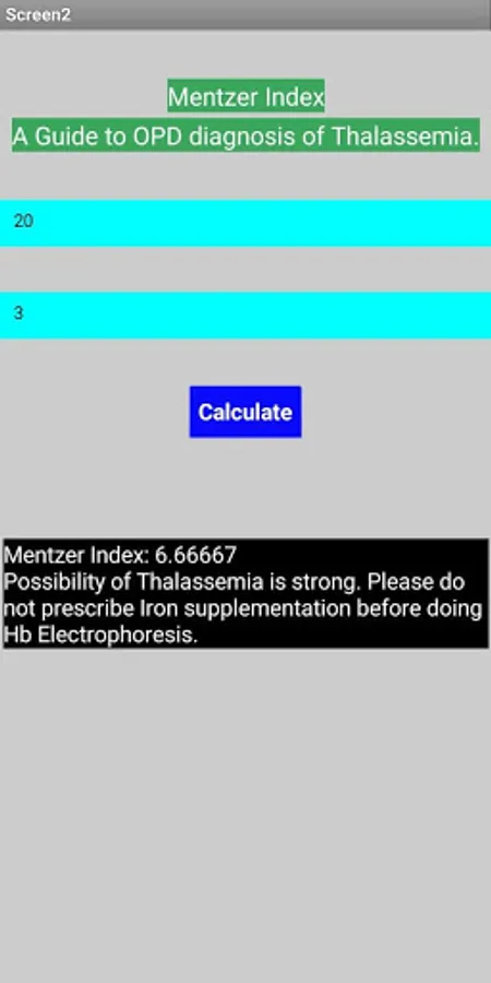 Thalassemia and Iron deficiency anemia are one of the common causes of microcytic hypochromic anemia. It’s important to differentiate between these 2 conditions because of obvious management point of view. Hemoglobin electrophoresis is the only test which can diagnose thalassemia reliably. But it is costly and not available widely particularly in developing countries including India. For this reason it is important to have some tool which can differentiate between thalassemia and iron deficiency anemia during routine OPD practice. Mentzer index calculator can give a fair idea of diagnosis on the basis of a simple complete blood count report. The only 2 input parameters include Mean corpuscular volume (MCV) and Red Blood cell count (RBC count) which is available in CBC report.This App will give you a fair idea about the presumptive diagnosis. Of course as a primary care physician you must take into account the clinical features and other lab parameters.