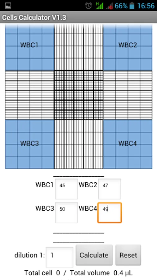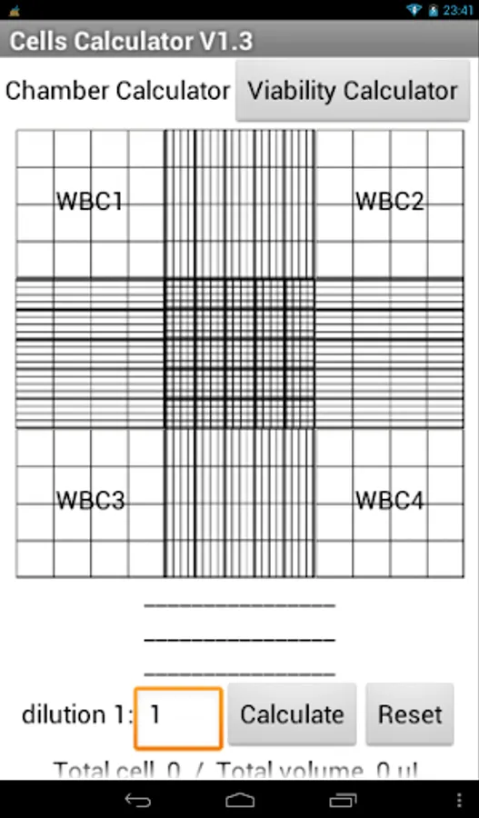 You just select the location of chamber where you counted the cell and fill the number of cell and then click the calculate button. The application will automatic calculate the density of cell in mL and uL for you.