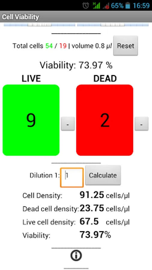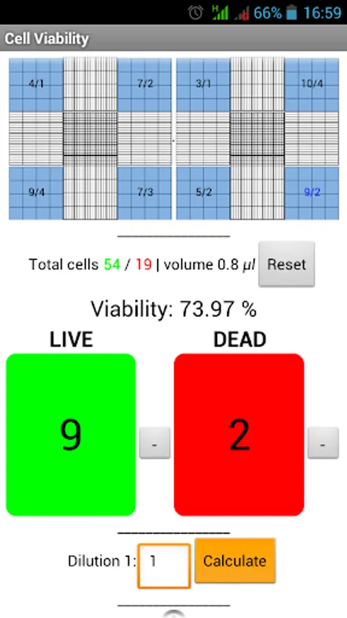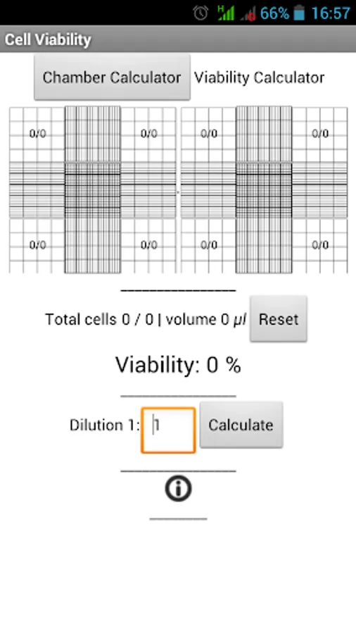 Cells Calculator is a tool to help you calculate density of cells in Hemocytometer. It has two mode, "Chamber calculator" and "Viability calculator".