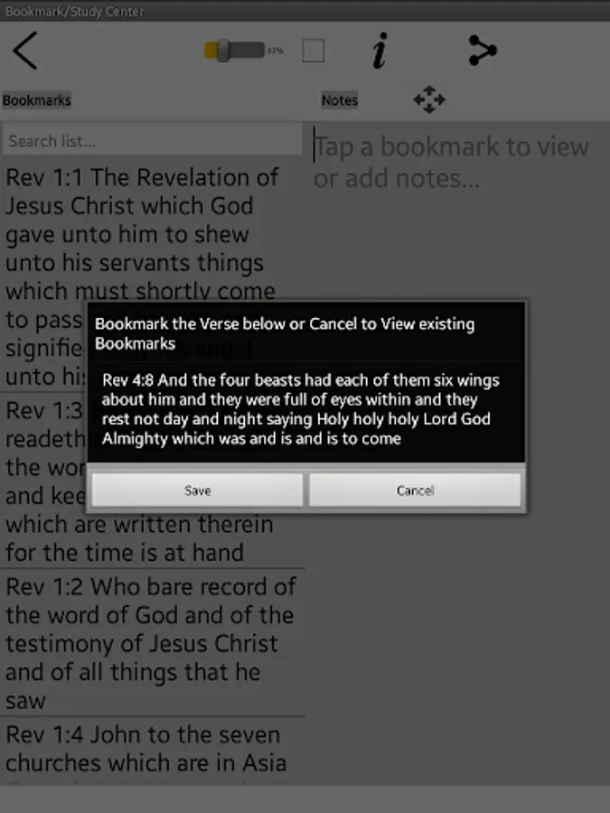 *The app allows the user to create bookmarks on each verse based on their study and allows the user to create study notes on each bookmarked verse of scripture.