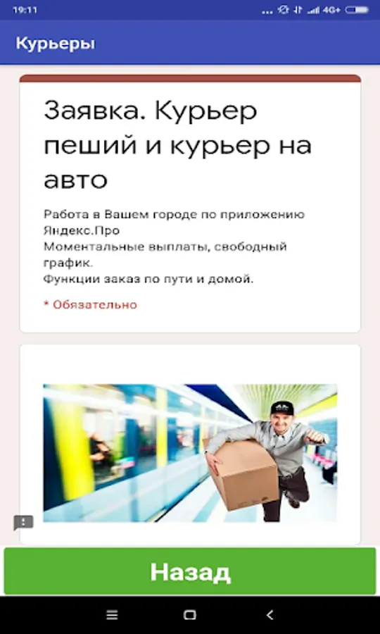 Any capable citizen of the Russian Federation over 18 years of age can connect to orders for work as a courier on foot.