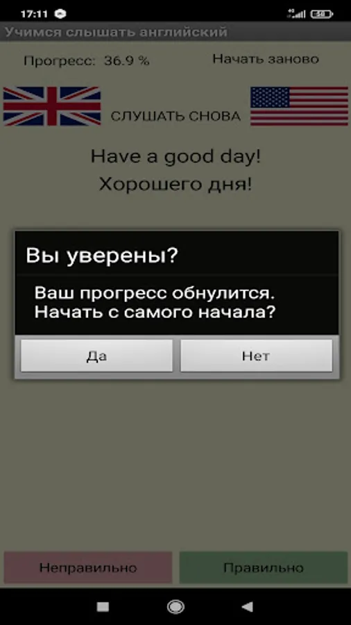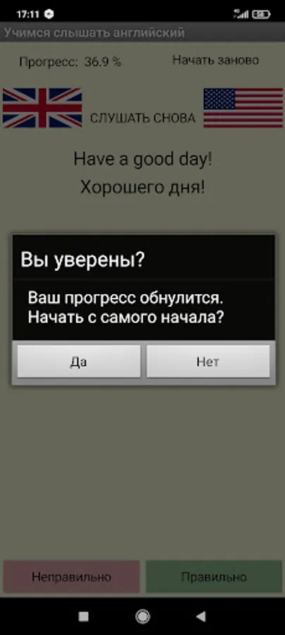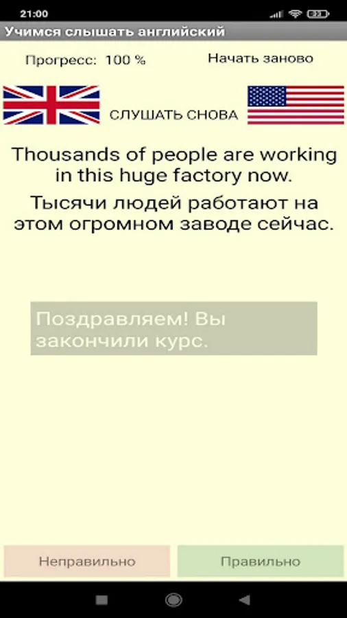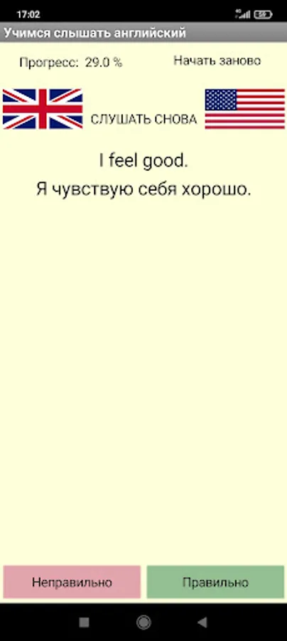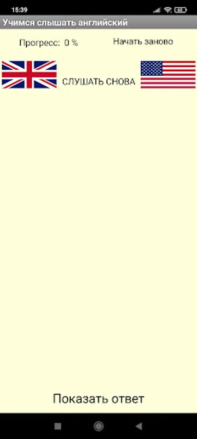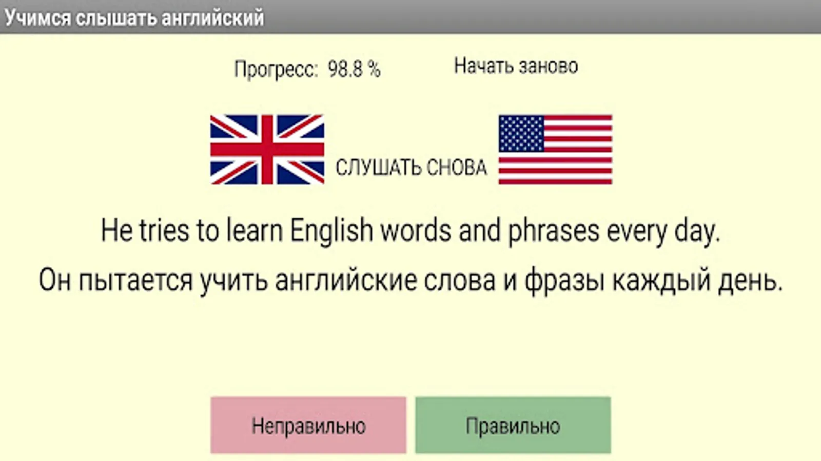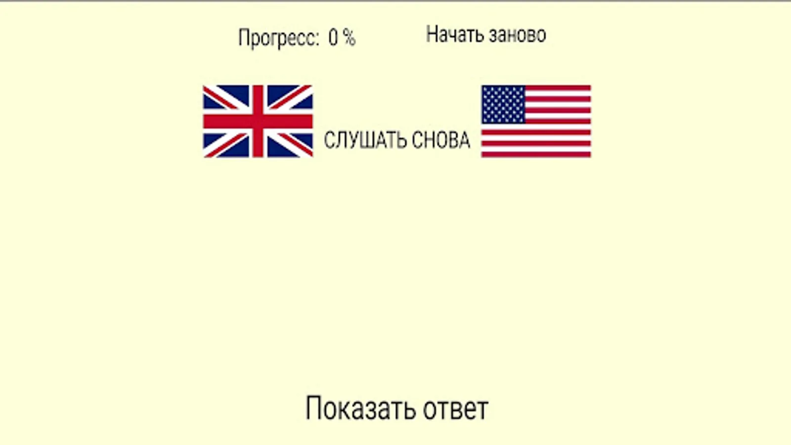 You hear a phrase in English and try to understand by ear what you heard. If just once is not enough for you, you can press the button in the form of the British or American flag, and the phrase will sound again a little slower with the British or American pronunciation, respectively.