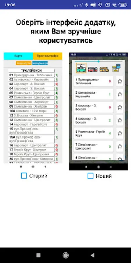 - in the main menu, switch the list of routes and stops by clicking on the picture with the image of the corresponding transport or stop;