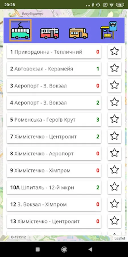 - all routes and stops are displayed in the favorites window, but if desired, you can display only transport or only stops by clicking on the corresponding icon next to the inscription "Favorites";