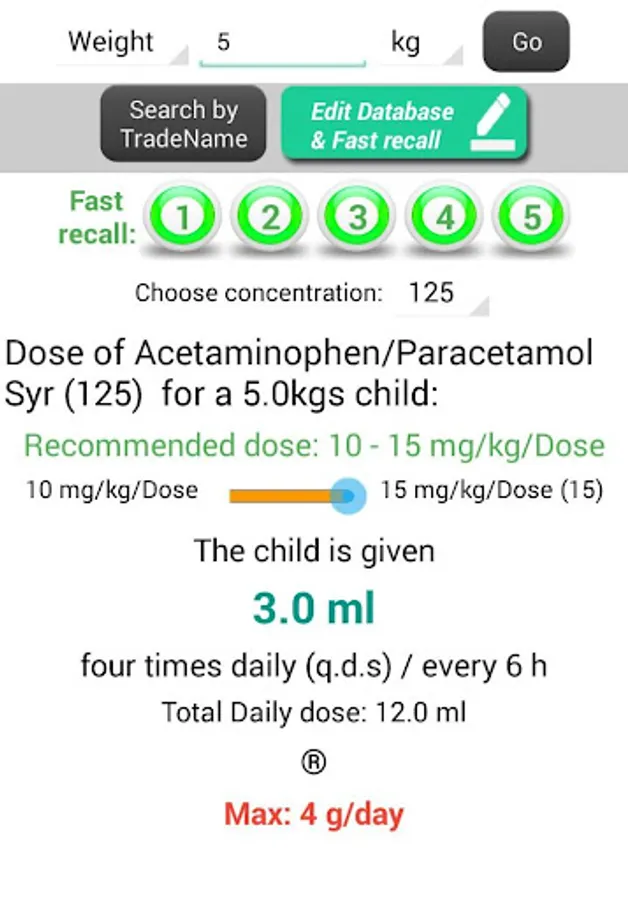 * Each drug shows: Recommended dose /kg, Dose for the entered weight by ml, Hints about the drug, Warnings & Trade names.