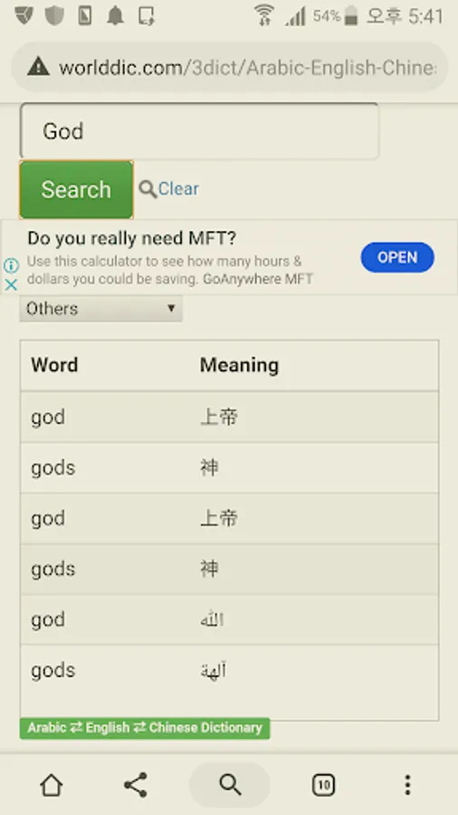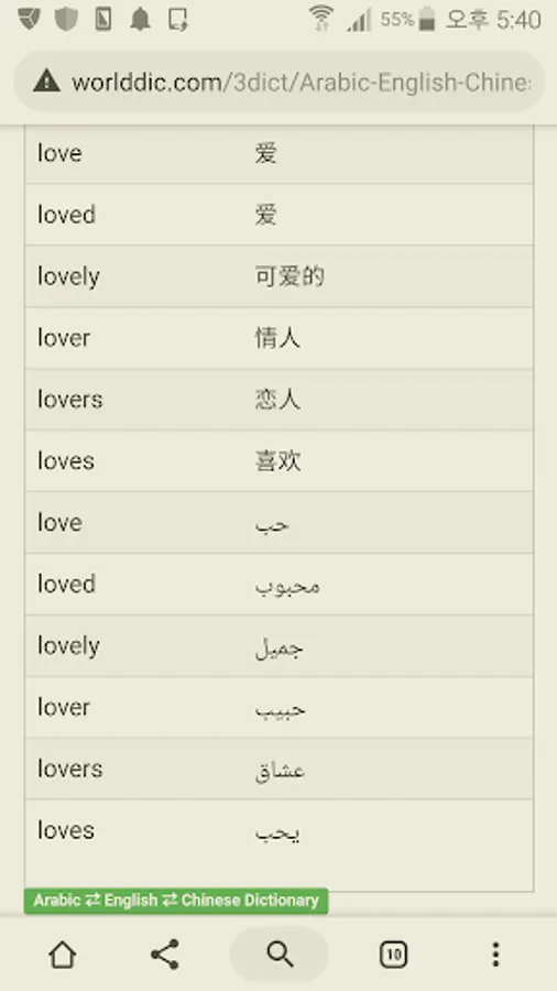 Chinese to Arabic, Chinese to English, English to Chinese words.