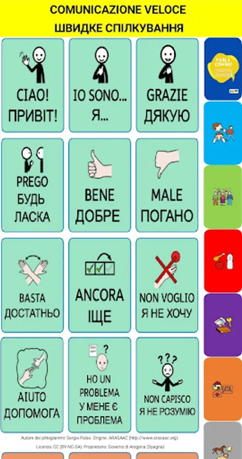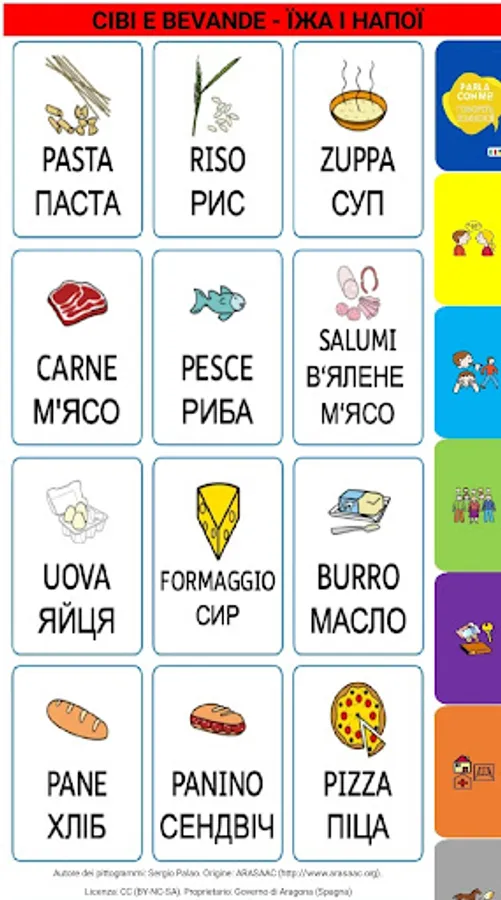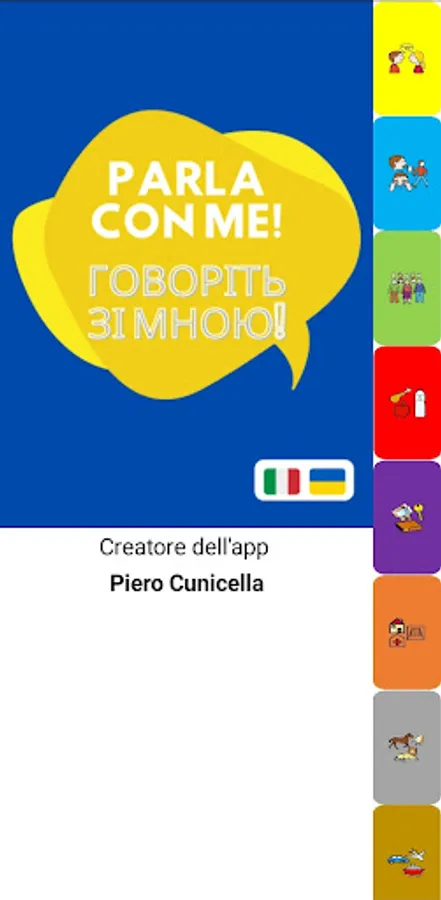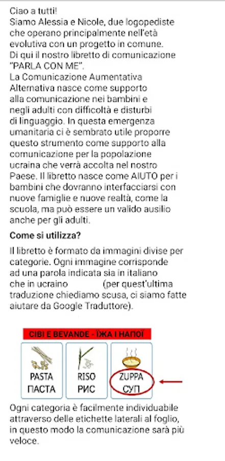 The booklet is made up of images divided into categories. Each image corresponds to a word indicated in both Italian and Ukrainian, by pressing lightly on the figures the text will be pronounced in Italian, while holding down a little longer the text will be pronounced in Ukrainian.