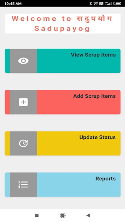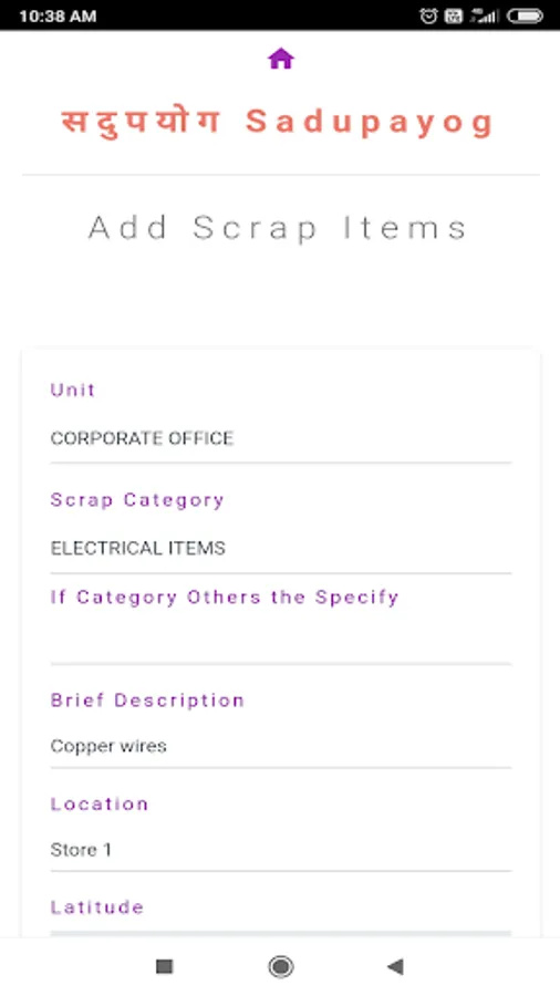 Users can add scrap items by using Sadupayog Scrap App, the fields to be entered are BHEL Unit, scrap category, brief description. Users have the provision to update the progress of scrap disposal using update status functionality. Location of Item is automatically picked up using location sensor, and latest photographs of scrap items can be clicked using a mobile camera.