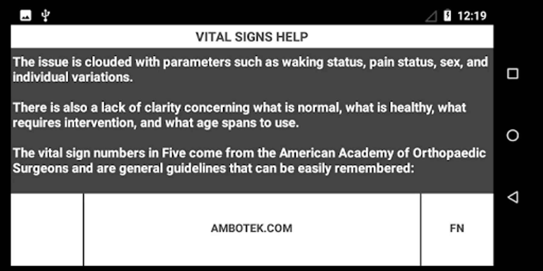 Ambotek Five is an EMS, multi-modal, right-or-wrong, self-tester for vital signs, Apgar (APGAR) scores, the Glasgow Coma Scale, the Revised Trauma Score, and START and JumpSTART triage systems.