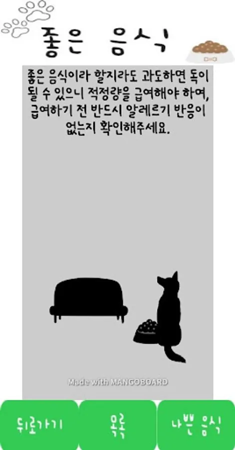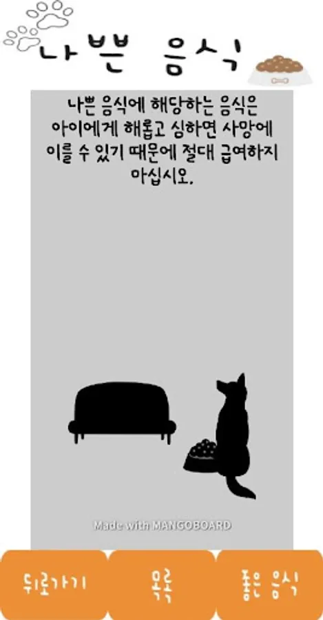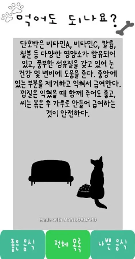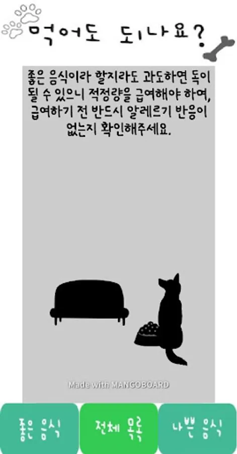 It's an app that tells dogs what good and bad foods can eat. You can see the food information at a glance by pressing the full list button on the main screen.