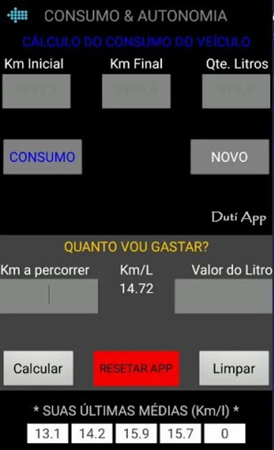 - You click on "Initial Km" and the value entered by you in the last supply will fill this field automatically, then you fill in the current mileage in the "Final Km" field and the total liters of fuel supplied, in the "Qte Litros" field. To rectify any of the current supply data, click on the "NEW" button. If all the data is correct, press the "CONSUMPTION" button. You will see the consumption reached and this saved in "YOUR LAST AVERAGES".