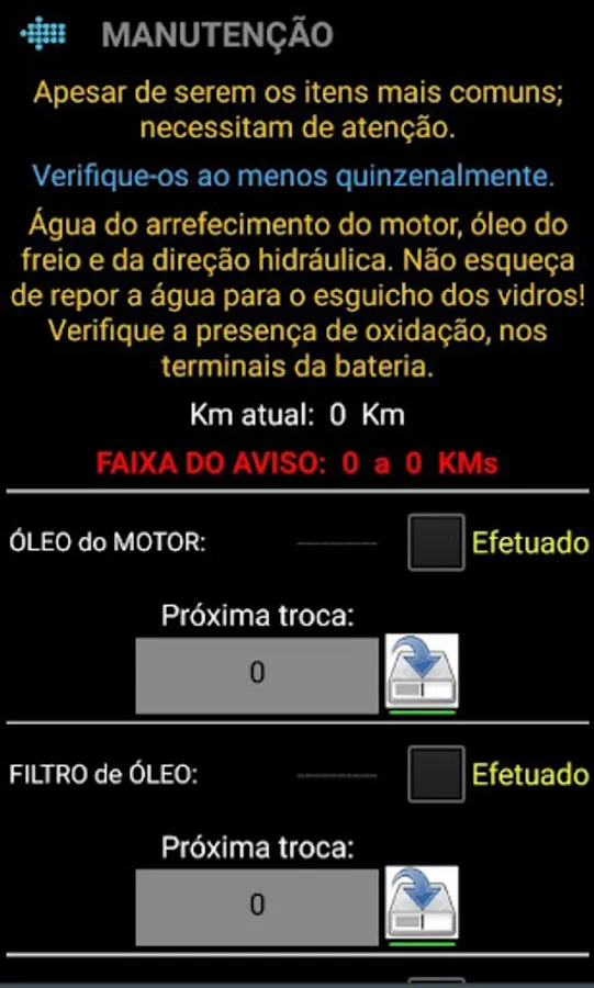 - MAINTENANCE SCREEN: Control of the basic maintenance of the vehicle (CAR, TRUCK, etc. or MOTORCYCLE); the mileage of the last and next maintenance, of the main items of your vehicle, such as crankcase oil, filters, belts, etc.