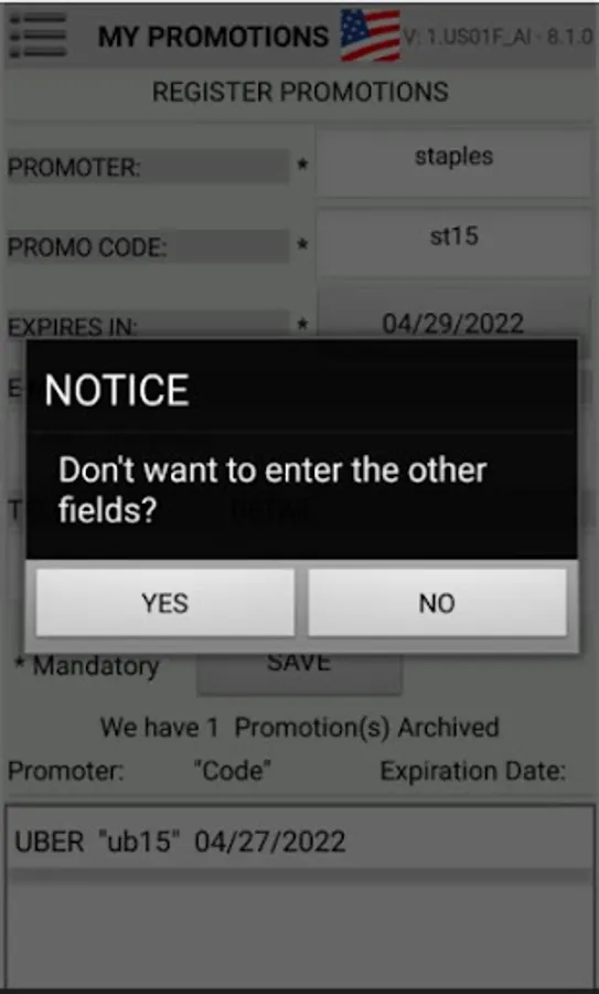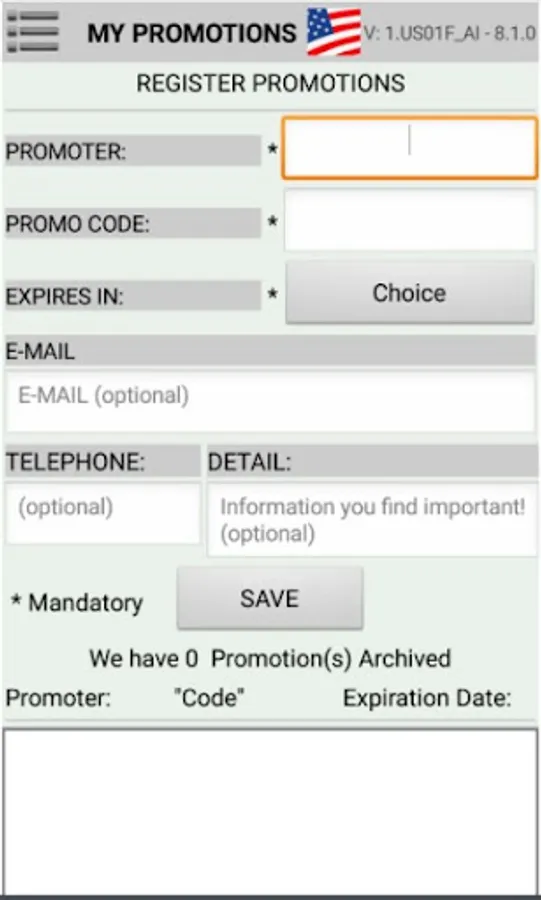 In the 'menu', under "REGISTER", as soon as you receive your coupon or promotion, you enter them in "My Promotions"; inserting the "PROMOTER", the "PROMOTIONAL CODE" (this 'case sensitive') and the "EXPIRATION DATE OF THE CODE" of this coupon! These three are mandatory! And, if you want to save the means of receipt of the promotion / coupon, (optional for the completion) will have the "E-MAIL", the number of the "PHONE" and a field to write some relevant and important "NOTE".