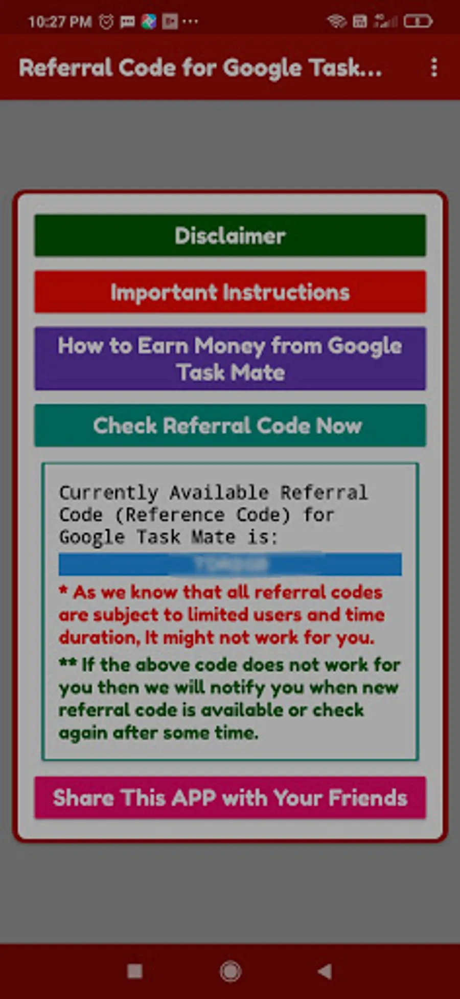 This App Referral Code for Google Task Mate tries to help you get referral code (Reference Code) for Google Task Mate from reliable sources and you can learn how to earn money from Task Mate.