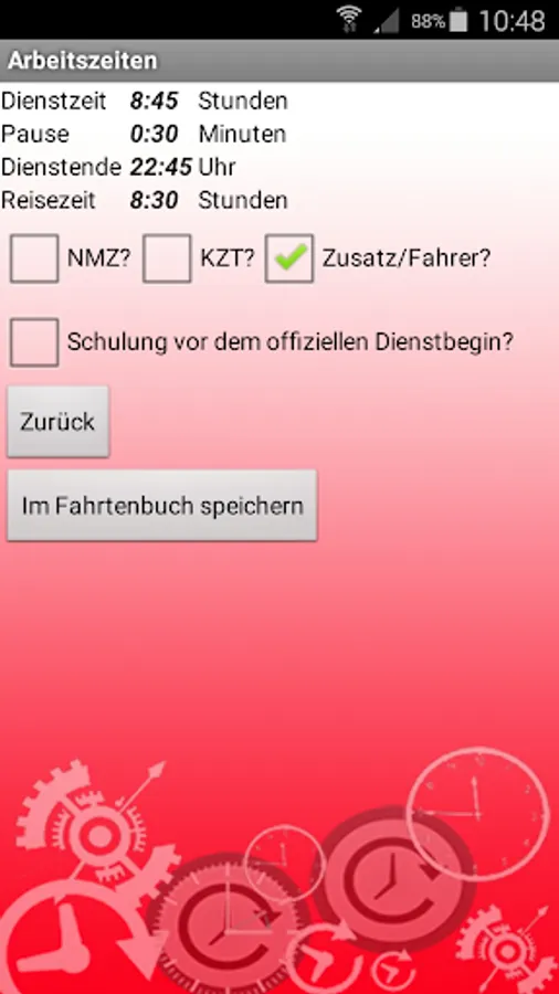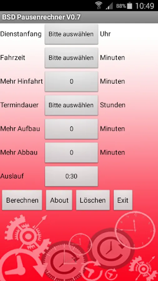 The BSD break calculator makes it easy to Evaluate the working hours for the field staff of the BSD Frankfurt. Currently lacks a way to charge one night. For a later version is possibly still the installation of a driver's logbook planned.