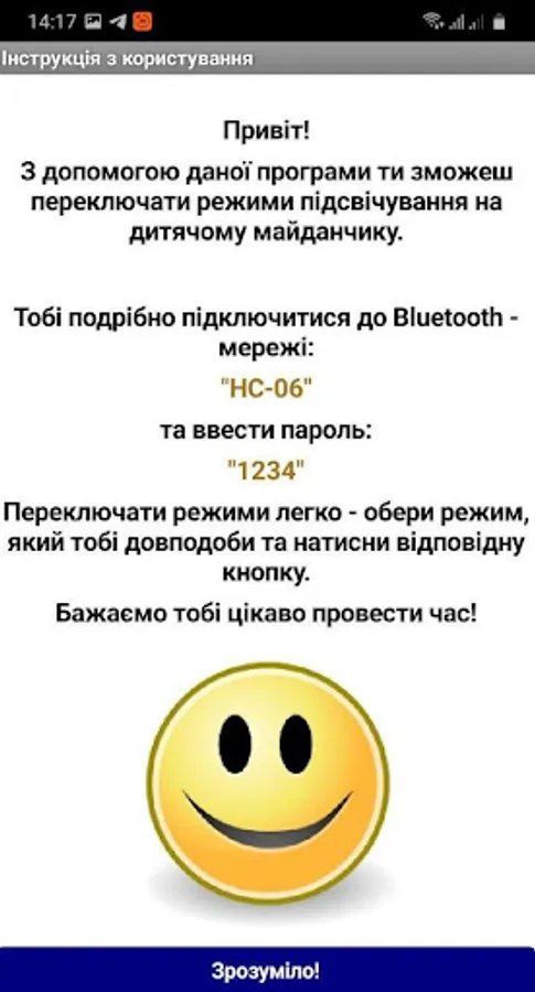 - Connect to Bluetooth - network "НС-06" with password "1234"
