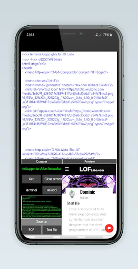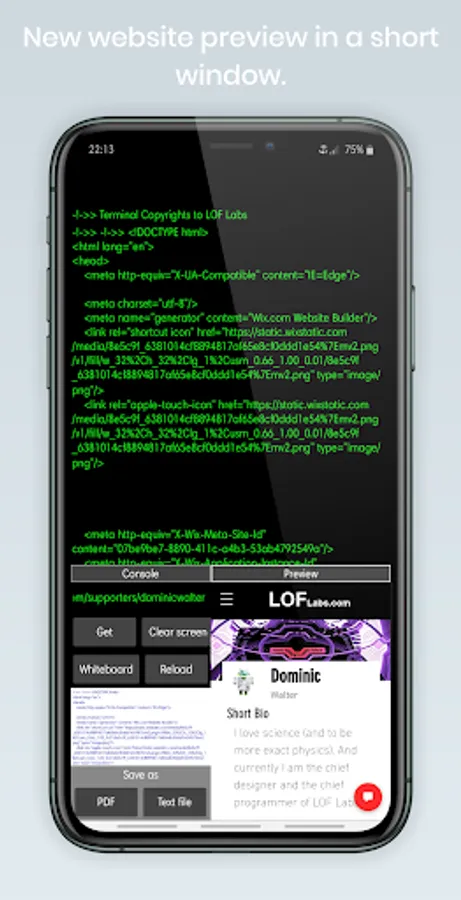 This application allows you to view the source code of any existing website by just typing the URL.App created by Dominic Walter for LOF Labs