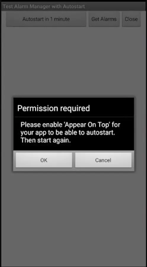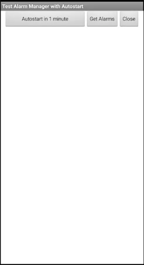 This test app is to test the alarmmanager extension with autostart. You can restart the app in one minute and the app closes automatically. At the alarm time the app will be started automatically and a looping sound is played. If the screen is locked, you first have to unlock the screen to stop the sound.