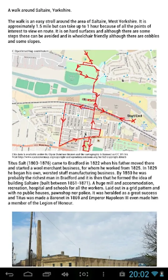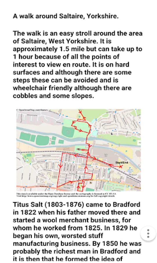 An interesting easy to follow walk of 1.5 miles around Saltaire Town Centre.