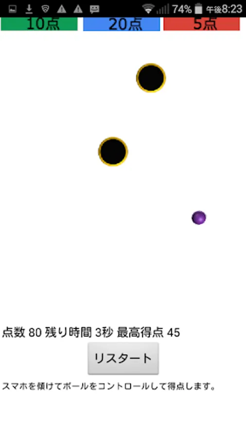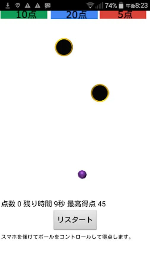 * Tilt the smartphone in 15 seconds, roll the ball and put the ball in the goal and score.