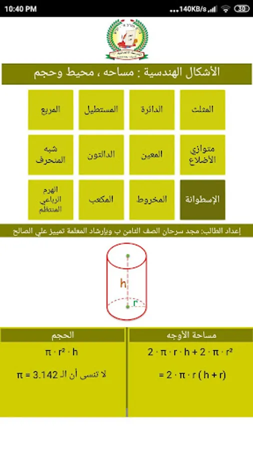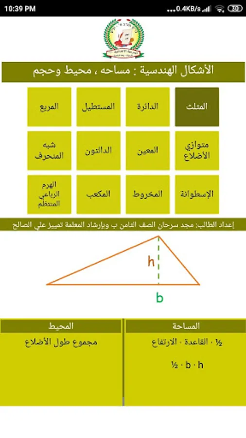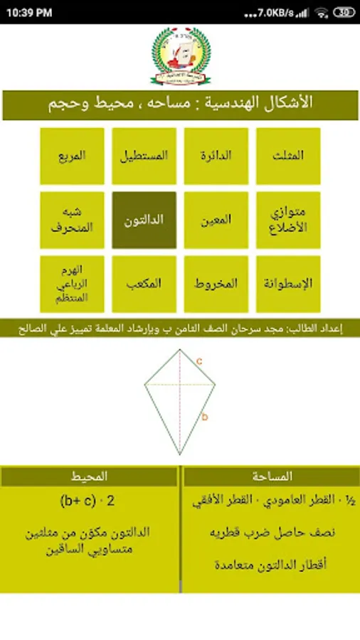 This free application was made by the student Majd Sarhan in the eighth grade in the preparatory school, Iefa Nazareth - the garden, and under the guidance of the teacher, distinction Ali Al-Saleh, which contains space and perimeter equations for 8 two-dimensional geometric shapes, in addition to calculations of the size and surface area of the 3-dimensional shapes, The application is very small in size and has illustrations.