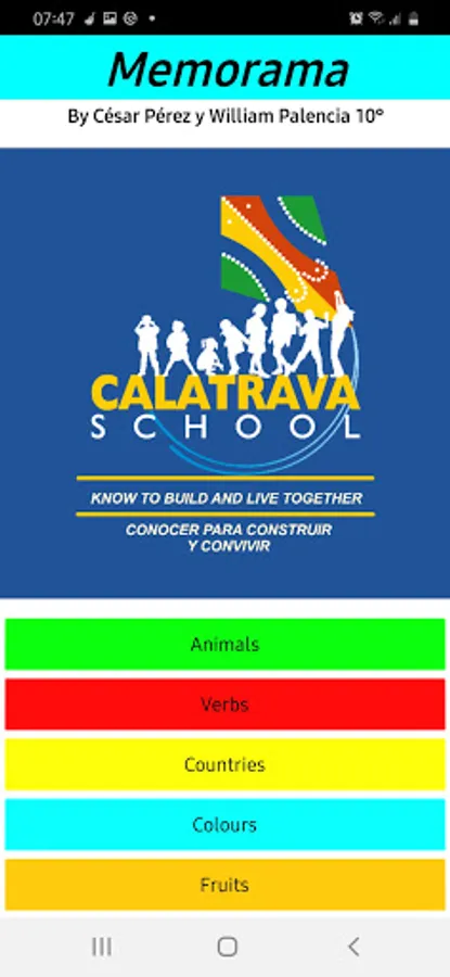 This completely free App allows you to exercise your memory with several exercises of matching figures classified by groups as well as helping you to review the English language. Created by students from Colegio Calatrava (Bogotá Colombia) and the Technology and Entrepreneurship Area.