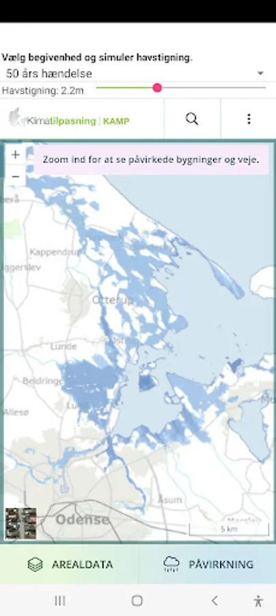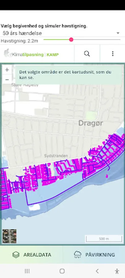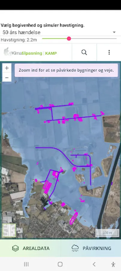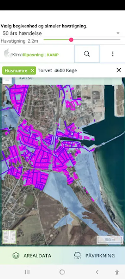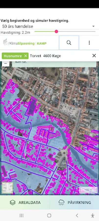 See exactly how the sea affects houses and land areas throughout Denmark.